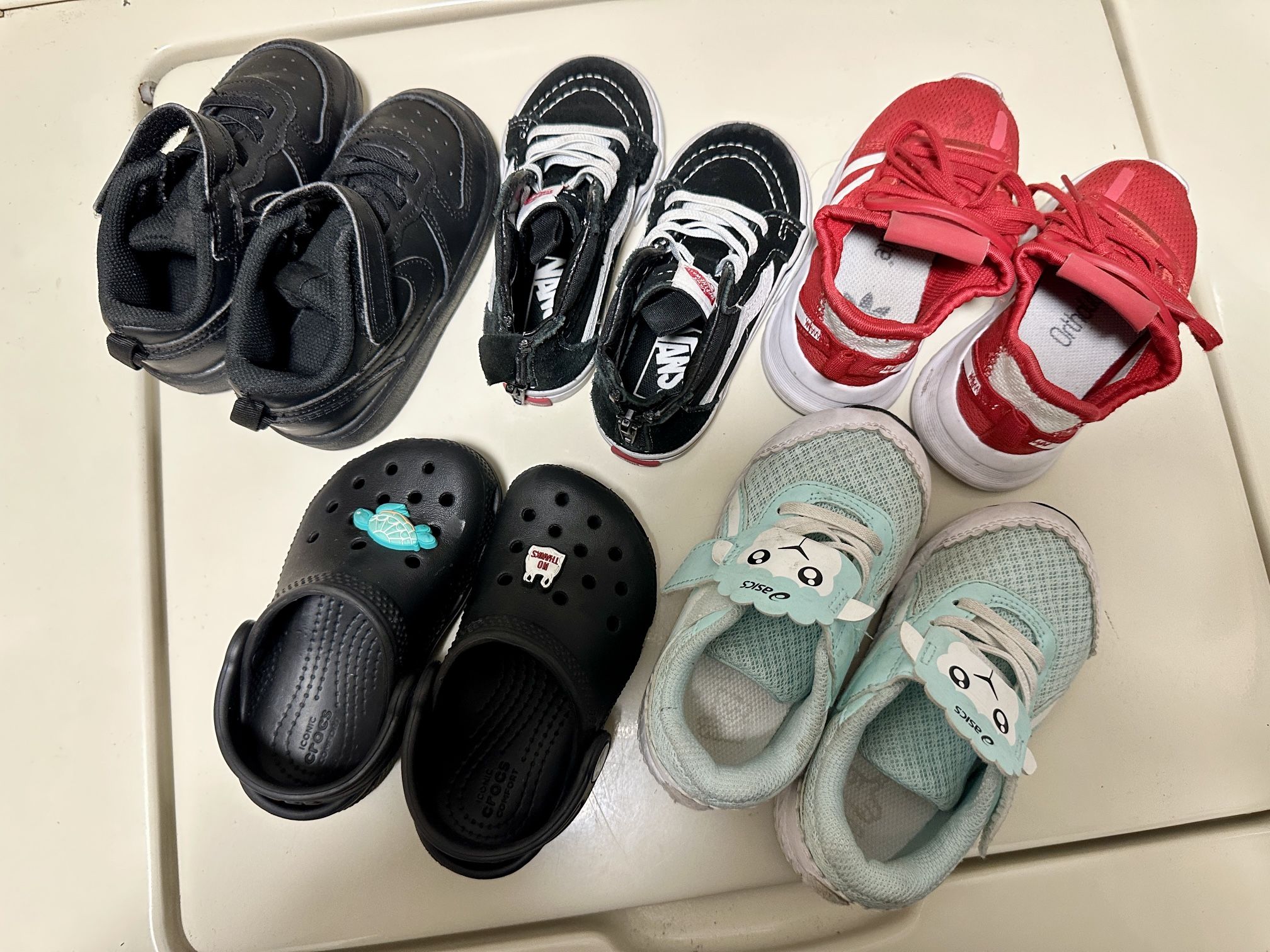Black Nike Shoes size 8T - $25 Asics Shoes size 8T - $15 Black Vans size 7T - $20 Red Adidas - 7T - $20 Black Crocs - 7T - $15