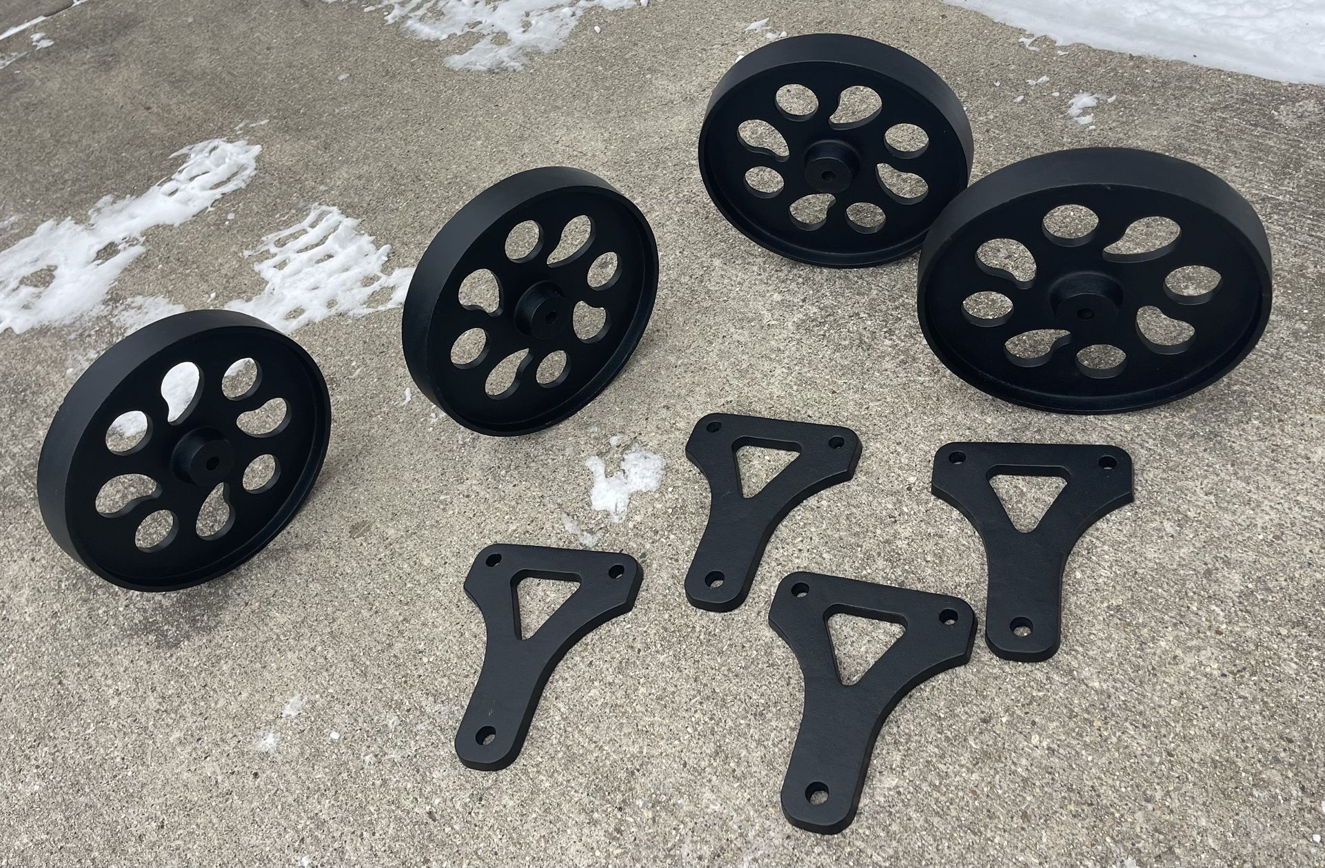 4 - Cast Iron Train Cart Type Wheels 10” these are perfect for an indoor cocktail table or outdoor garden cart with side mounts.