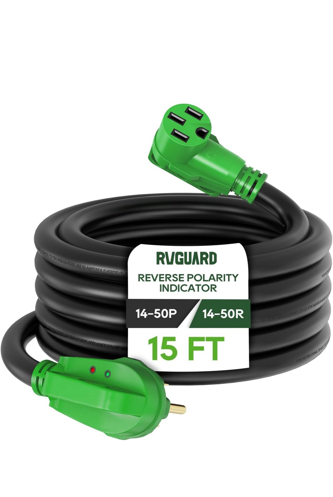 RVGUARD 50 Amp 15 Foot RV/EV Extension Cord with Reverse Polarity Indicator, NEMA 14-50P/R Heavy Duty Extension Cord with Cord Organizer, Green, ETL Listed 465