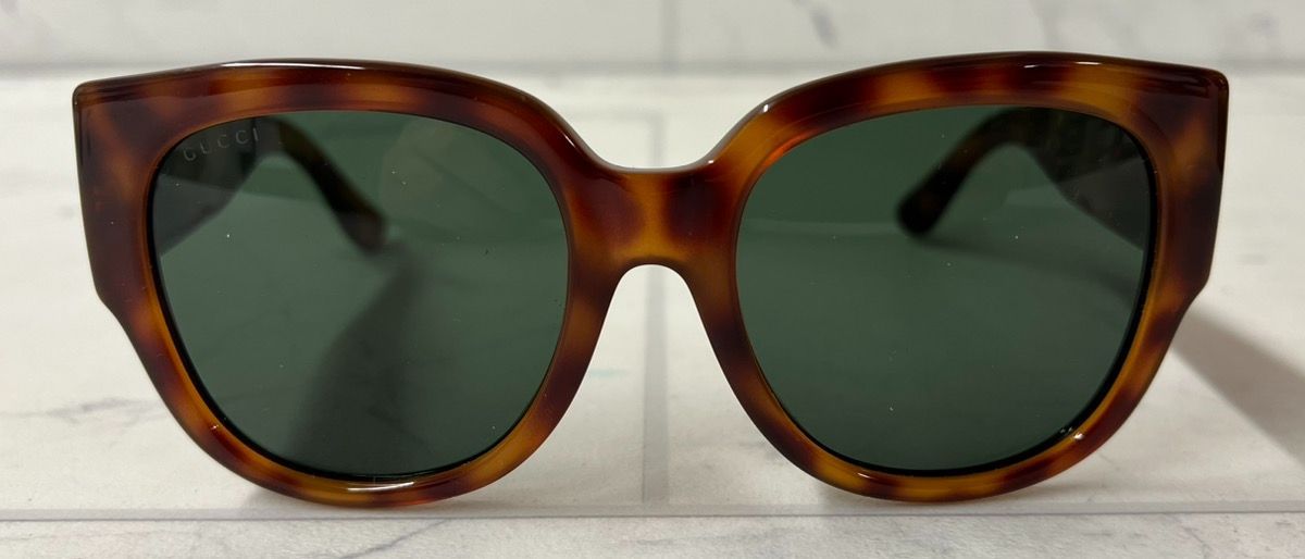 SUNGLASSES: GUCCI MODEL GG0142SA, GUCCI GG0142SA ACETATE SQUARE FRAME, TORTOISE SUNGLASSES, HAS SOME SCRATCHES: LIGHT 1/2" INCH SCUFF LOWER SIDE OF OF FRAME LEFT SIDE/3X1MM SCRATCHES ON THE UNDERSIDE OF THE LEFT LENS,