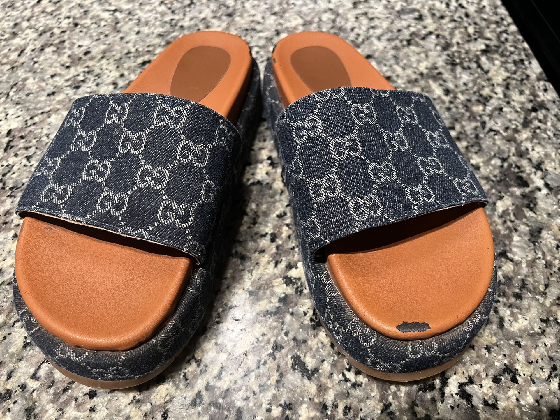 Gucci Authentic Blue Angelina Logo-jacquard Organic Denim Platform Sandals
