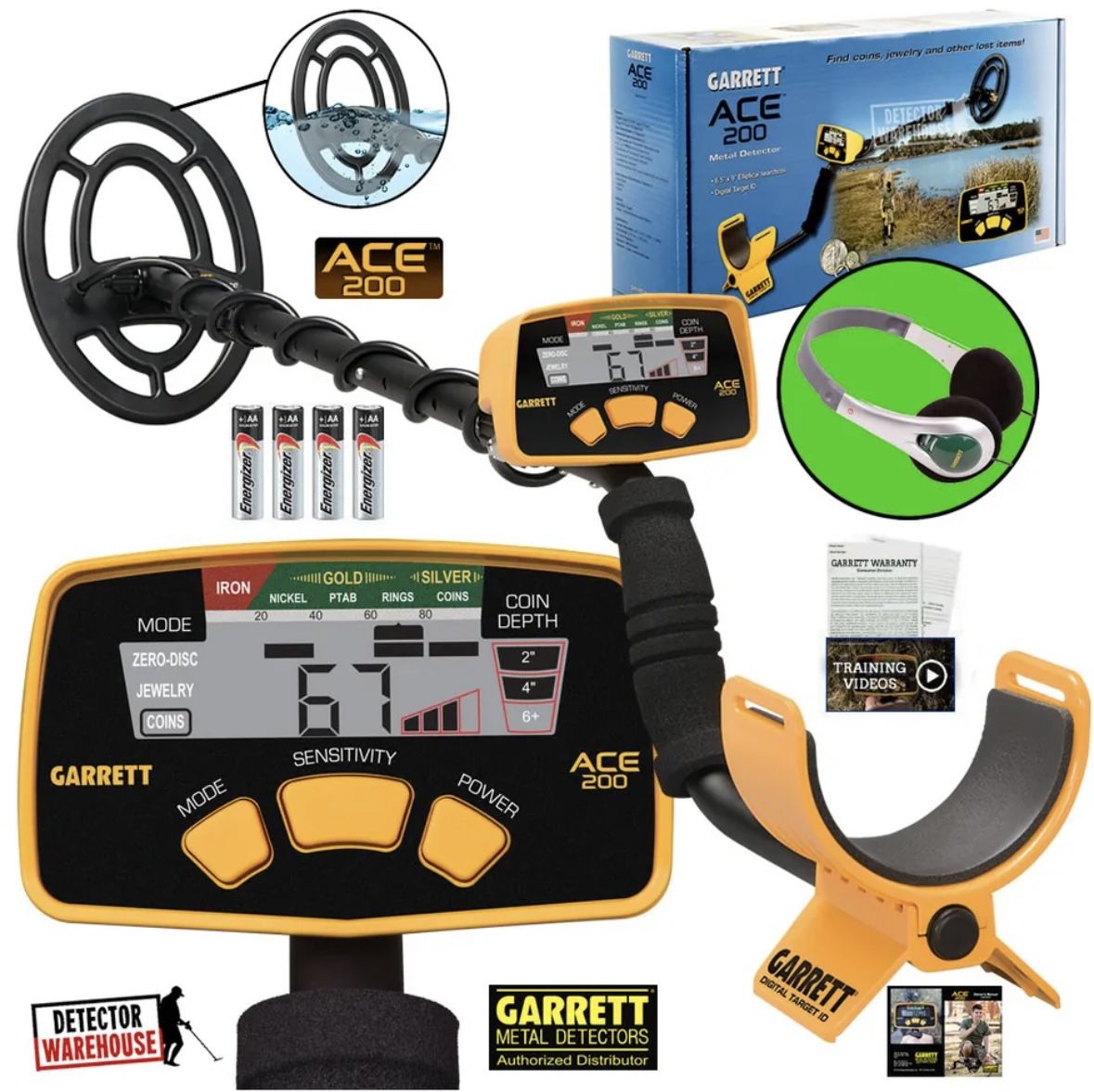 Garrett ACE 200 Metal Detector with Waterproof Searchcoil with Garrett Treasure Sound Headphones You won't find a lower Price!! With the quality and performance of the Garrett ACE 200 Metal Detector, you can begin finding treasure right away—in your own backyard or wherever you travel. Easy to use for any age! Recommended for: Coin Hunting (Gold/Silver/etc.), Dry Beach/Fresh Water Hunting, Jewelry Hunting, Relic Hunting, Competition Events Here is what you'll receive: Garrett ACE 200 Garrett 6.5" x 9" PROformance Submersible Waterproof Searchcoil Garrett TreasureSound Headphones User Manual Access to Online Training Videos Garrett Buyer's Guide 4 AA Batteries Installed 2 Year Warranty