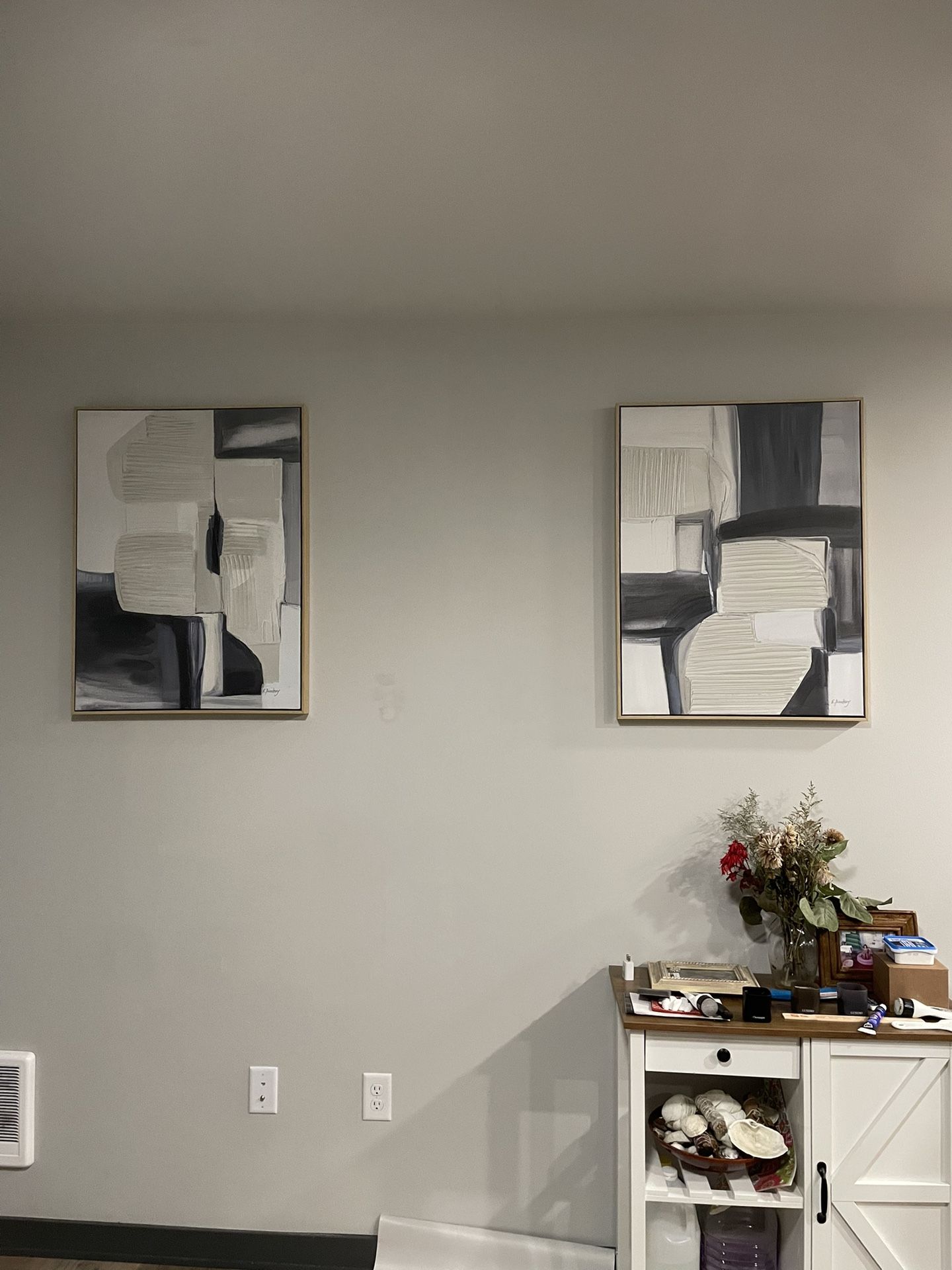 Elevate your space with this beautiful set of two oversized abstract canvas prints by artist E. Roadsey. Featuring a sophisticated monochrome palette with bold black and charcoal brushstrokes on a crisp white background. These pieces fit perfectly with Modern, Minimalist or Industrial decor. Both pieces come in high quality floating frames, which give them a high-end gallery look. They are in excellent condition and ready to hang. Selling due to a new move and they do not fit well with the aesthetic of our new home. - Artist: E. Roadsey - Style: Modern Abstract/ Minimalist - Format: Textured Gicleé on Canvas - Frame: Premium Wood-Style floating frames - Dimensions: 25.5” x 37.5”