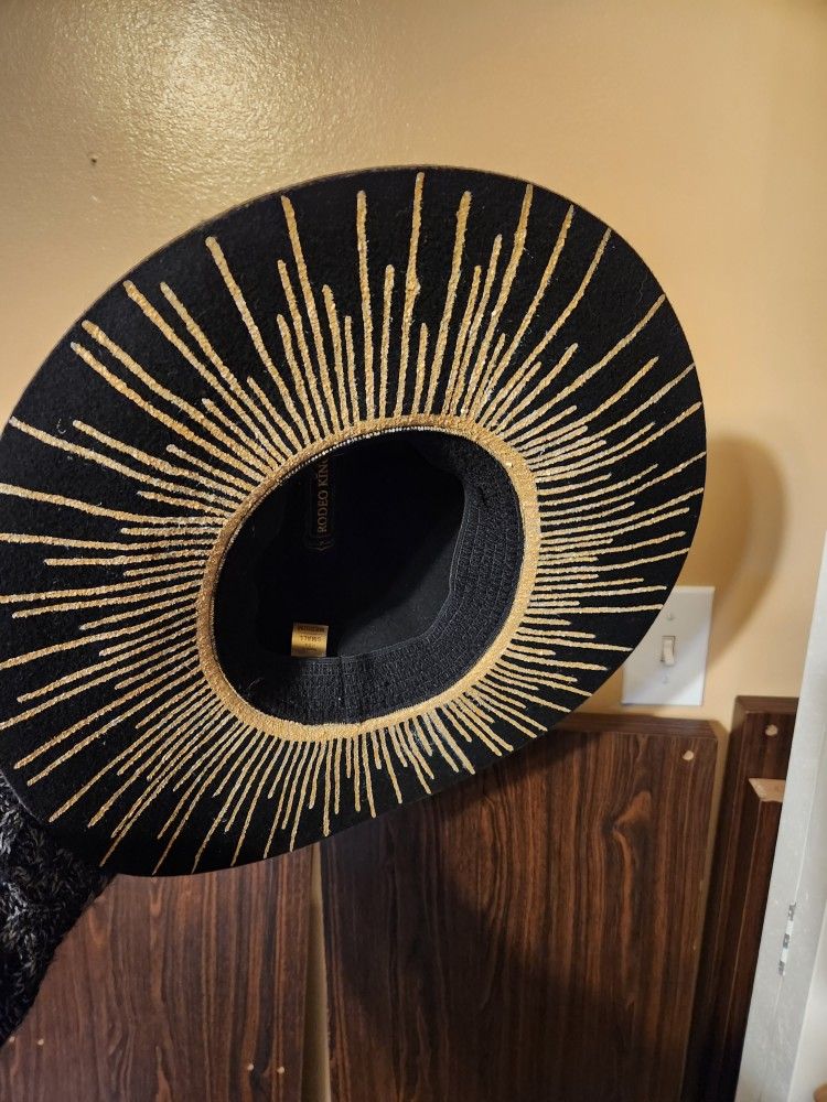 Black wool felt wide brim hat with hand painted golden halo. Size small. Similar to stetson style hats. Goth bohemian style.
