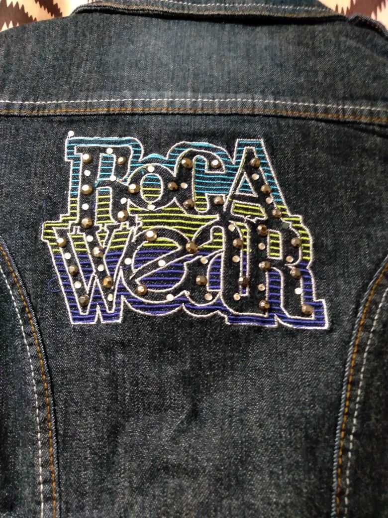 Girls Roca Wear Size 6 Denim Jeans and Jacket. Matching set with lime/ purple threading and jewels. Gently used/perfect condition