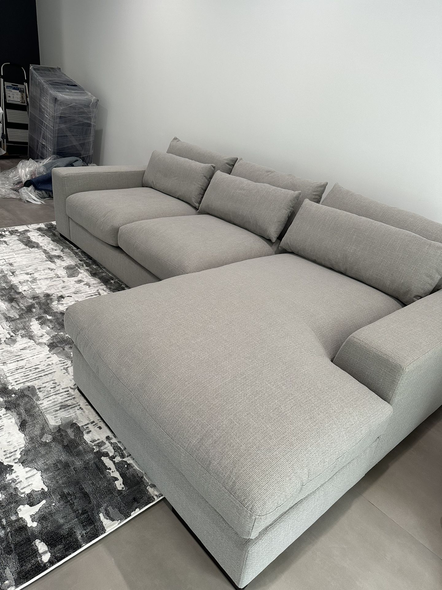 Remy Gray Fabric Right Chaise extra deep Sectional. Very lightly used. Was bought originally for $2,500 Height-24 inches Width-124 inches Depth-37 inches