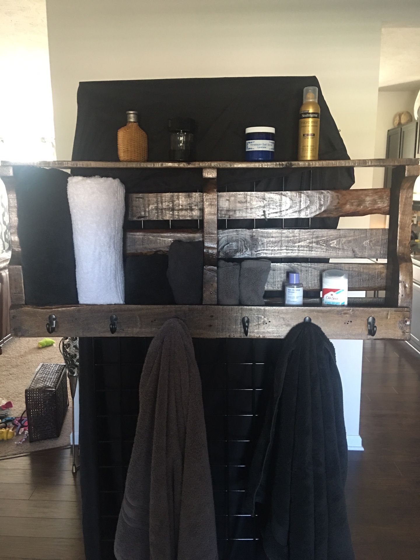 I can make any size and color if you’re looking for a wine/liquor bottle holder with glass holders underneath. Or a coat rack with railroad spikes, bolts, or hooks to hold your coats. Also nice for towel rack and bathroom accessories holder. My skids are stripped apart, sanded, and rebuilt to fit the size you’re looking for. Prices between $50-75 depending on the size. Have tons of colors and I’ll try and fit your need. Thanks.