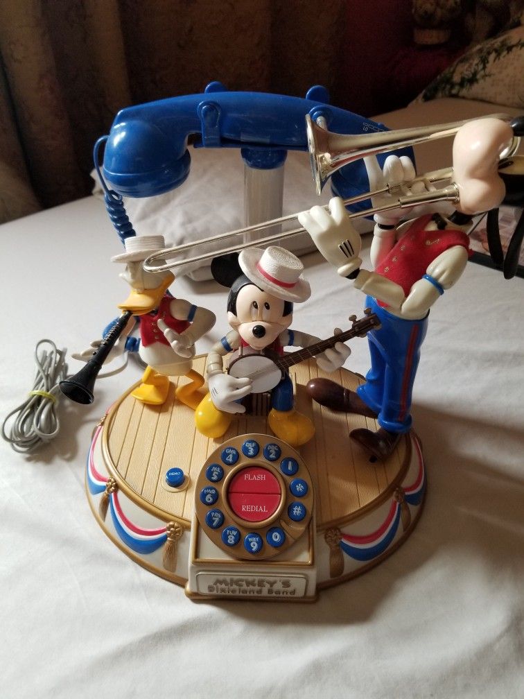 Mickey, Donald and Goofy have their Instruments and plays a song and Dances, there is a button for Music and it is a real working Phone, if you have Kids they will enjoy this Phone, wells fine No flaws at all