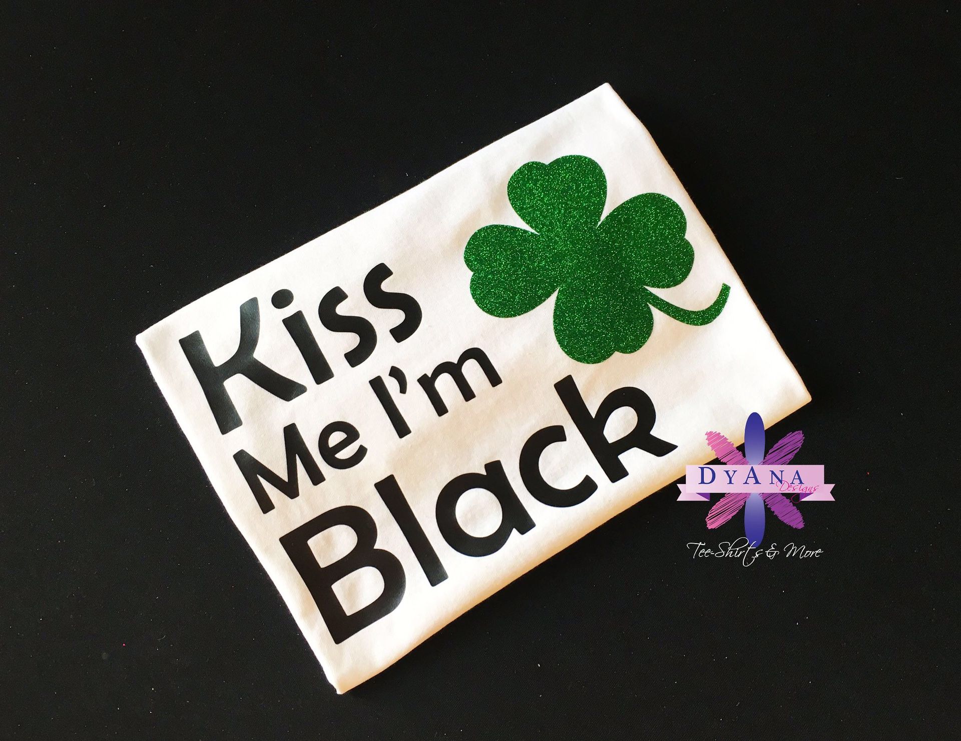 Kiss Me I'm Black - Perfect shirt for the black Irish in you! Shirts and vinyl come in multiple colors. Shirts are fully customizable. You choose your shirt color and vinyl color for the text and shamrock. Shirts are on SALE starting at $16 per shirt. Shirts with glitter start at $19 for per. 7% tax added to all shirt prices sold in Florida. Sizes are Adult Small to 4X. You can add a name ($5.00 per shirt) to the back of any shirt. SHIRT COLORS: Black, Forest Green and White. VINYL COLORS: Black, Green, White, Metallic, Glitter Black, Glitter Green, Glitter Copper Gold and Glitter White. Check out my Etsy shop for more shirt options. Local seller located on Westside, Jacksonville, FL. Purchase directly from me or through Etsy. Contact me for details. DyAna Designs Tee-Shirts & More