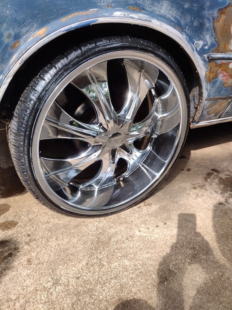 Velocity 24" 5x5 good tires, no dry rot 90% tread 275/25/24. One rim has a slow leak, but can get the bead sealed . All center caps. OBO, OR Trade for 5x120, 5x4.75 24" or 26" can add cash.