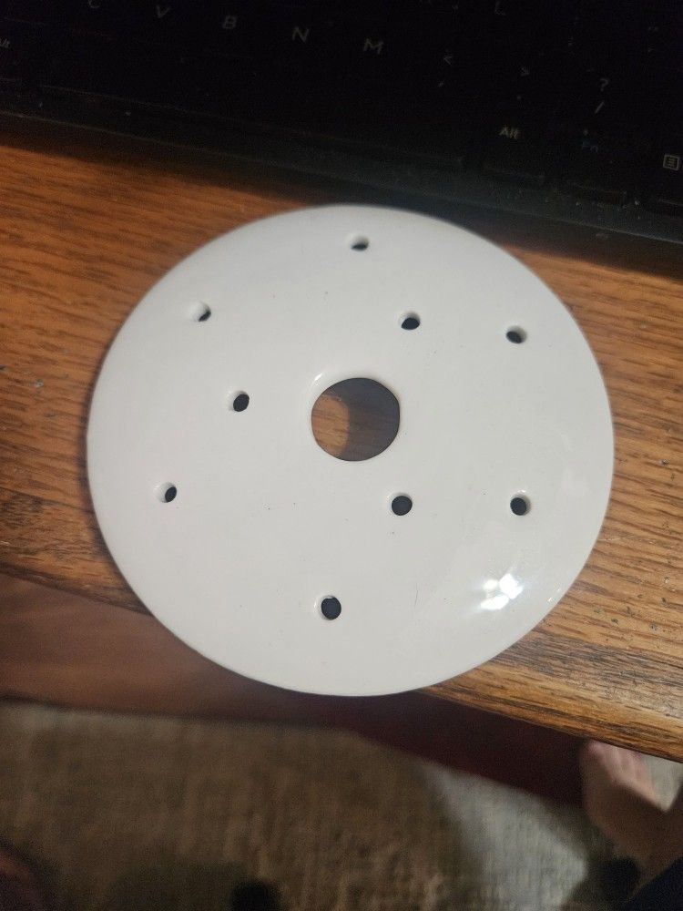 I am selling a porcelain strainer insert, possibly for a round covered butter dish. Item is in excellent condition as I see no chips or dings. Item appears to be new and never used. Item has no makers marks. Item probably dates back to the 1960s. Item measures 4.25" in diameter X 3" in diameter at the bottom X 0.25" deep.