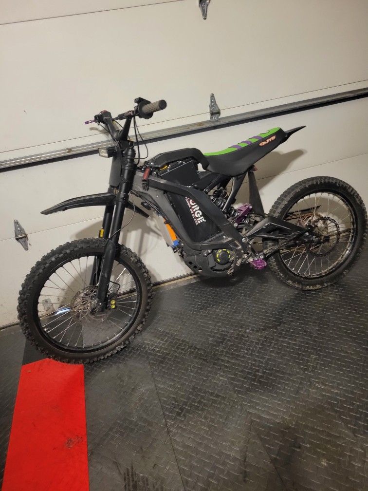 Actual HEAVILY modded Surron Light Bee X emoto *OPEN TO TRADES VALUED AT $6200+ or equivalent cash on your end Send offers Don't waste your time with "modded" surrons that have only have superficial mods like powder coated frames and seat covers This is my personal bike, meticulously built and babied Modded for comfort and performance Nothing matches the playfulness and reliability of the O.G. Tuned to hit 70mph, could easily be tuned to hit higher top speeds Basically brand new Sotion motor Rewired for QS8 high power connector Basically brand new jackshaft Basically brand 72v 45ah Amorge battery BAC4000 Controller Basically brand new Rfloxa rear shock Charged Cycle/Suspension Syndicate tuned DNM front fork Brand new Warp 9 riser bars Grit Shift direct stem mount/riser Stem lock Brand new Primary Drive Gold Plated 420 MX race chain New ProTaper Pillow Top grips Hayes Dominion hydraulic brakes W9 220mm rear brake rotor Upgraded triangle and linkage Tusk Groundwire tire up front/Shinko 241 rear Upgraded pegs Gritshift Blazer headlight with kill switch 54T sprocket Guts seat cover on top of Luna Float seat (extra thick) Will include Kaniwaba pedal kit and Luna subframe riser TAGS: Talaria Sting Eride Pro Stark Varg Electro & Co RTR Ultra Bee Van Truck Toyota Chevrolet Jeep Dirtbike Quad Honda Kawasaki Yahama