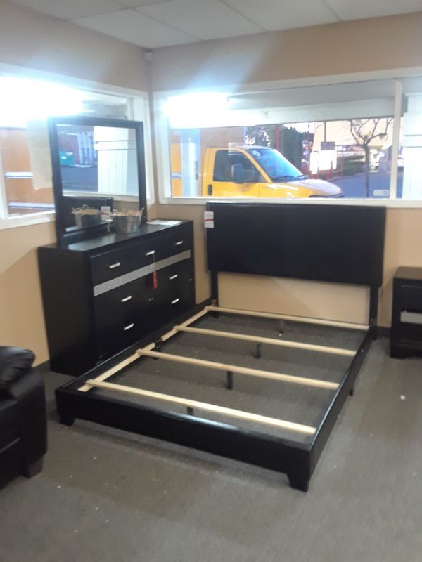 4PC QUEEN BEDROOM SET: QUEEN BED FRAME, DRESSER, MIRROR, NIGHTSTAND