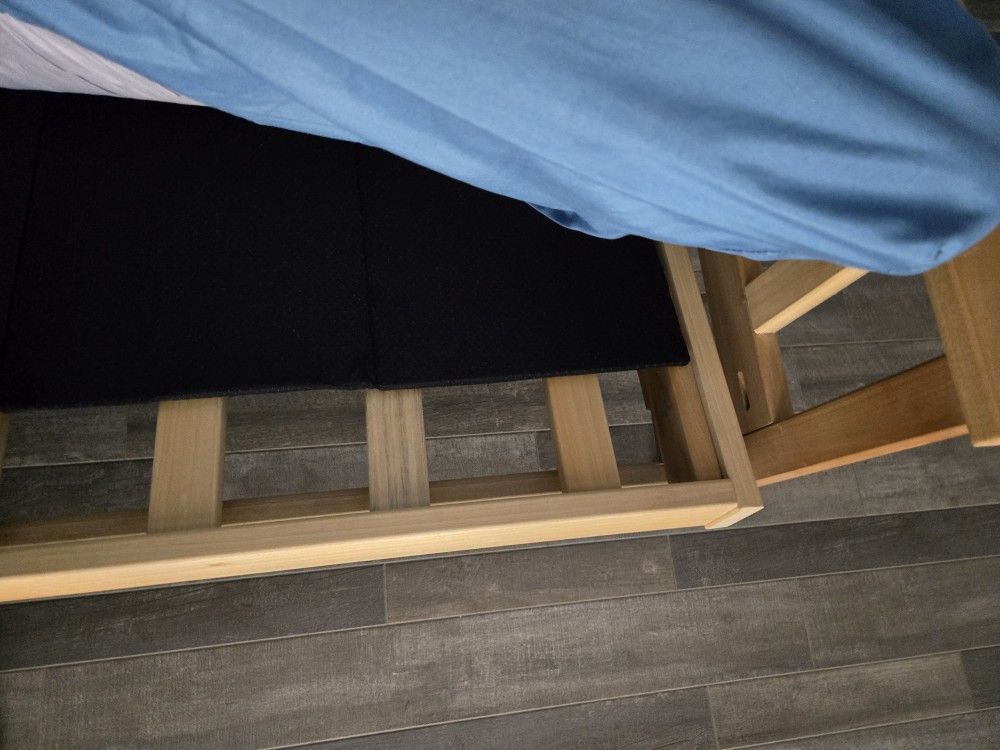 Sturdy wooden futon has a light-colored timber frame with a slatted back and seat. It includes a thick grey mattress protected by a removable blue fabric cover. The piece is versatile for seating or sleeping.