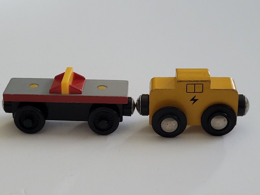 (Lot Of 2) 2003 Thomas & Friends Wooden Railway Train Rocky's Front Magnetic Car. This lot of two 2003 Thomas & Friends Wooden Railway Trains includes Rocky's Front Magnetic Car. These toys are perfect for any Thomas & Friends fan who loves to collect train cars and play with them. The trains are made of high-quality wood and are designed to last for many years of playtime. The magnetic connectors make it easy for children to connect and disconnect the cars, adding to the fun of playing with them. The brand of these trains is Thomas & Friends, and these trains are used but in great condition, ready to be enjoyed by a new owner. Add these to your collection today and watch your child's imagination soar!