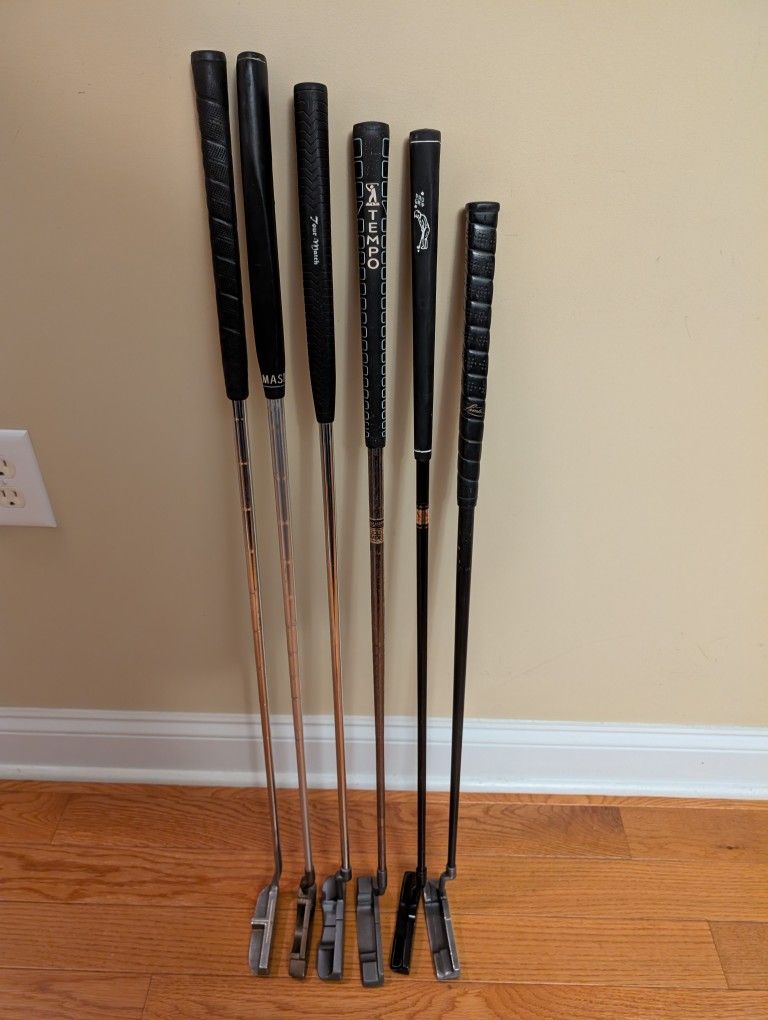 Golf putters: T-Line V by PGA - 36" long Barun Pro-1 - 36" long Foremost FZP-1 - 35" long Triumph Dorado (Scotland) - 34" long Pro Kennex P-30 - 34" long Players PMI - 32" long $10 each or all 6 for $50. Smoke free home. Cash only. Pick up in Garner near 801 Poole Drive (for map reference).