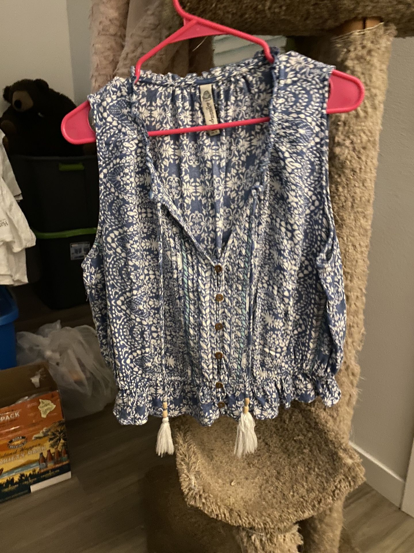 This XL (runs a lil small) blouse (Matches the american rag skirt I posted) is a pretty a blue with small white flowers.