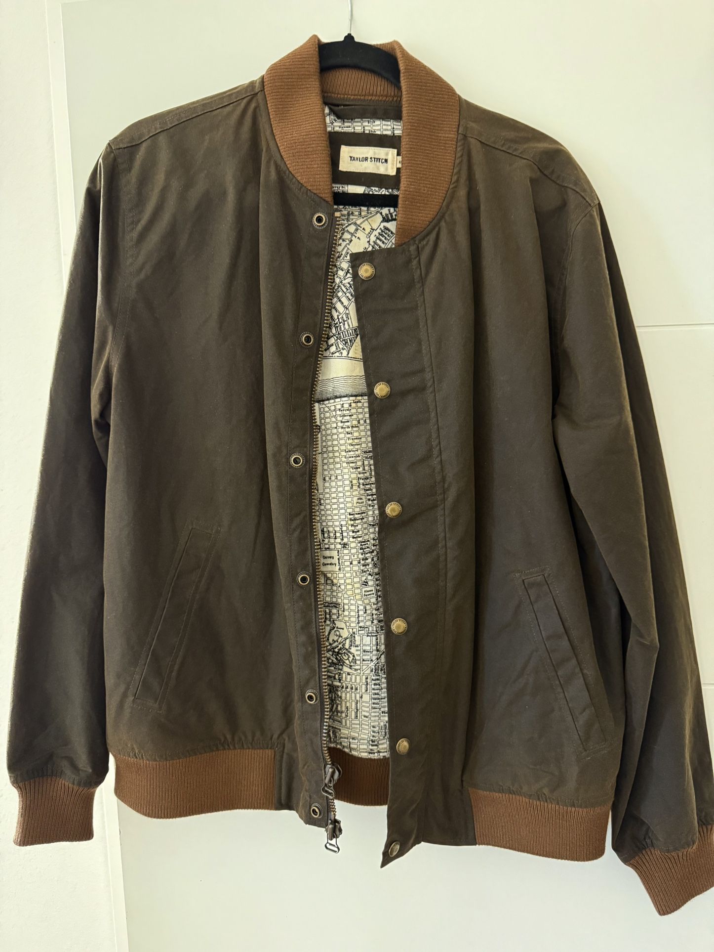This is a limited edition, no longer made, waxed canvas jacket. The inside has a beautiful SF map design and the earth tone color of the jacket looks great. It is in a medium size. 9-oz. 100% organic cotton. 100% plant-based EverWax developed by Halley Stevensons of Scotland. 5-oz. 100% organic cotton vintage SF map lining. 30% wool, 70% acrylic rib at collar, cuffs, and bottom opening. YKK two way separating antique brass zipper at center front. Storm flap with painted metal snaps. Two lower welt hand warmer pockets. Interior welt pocket at chest height. Local pickup and cash only.