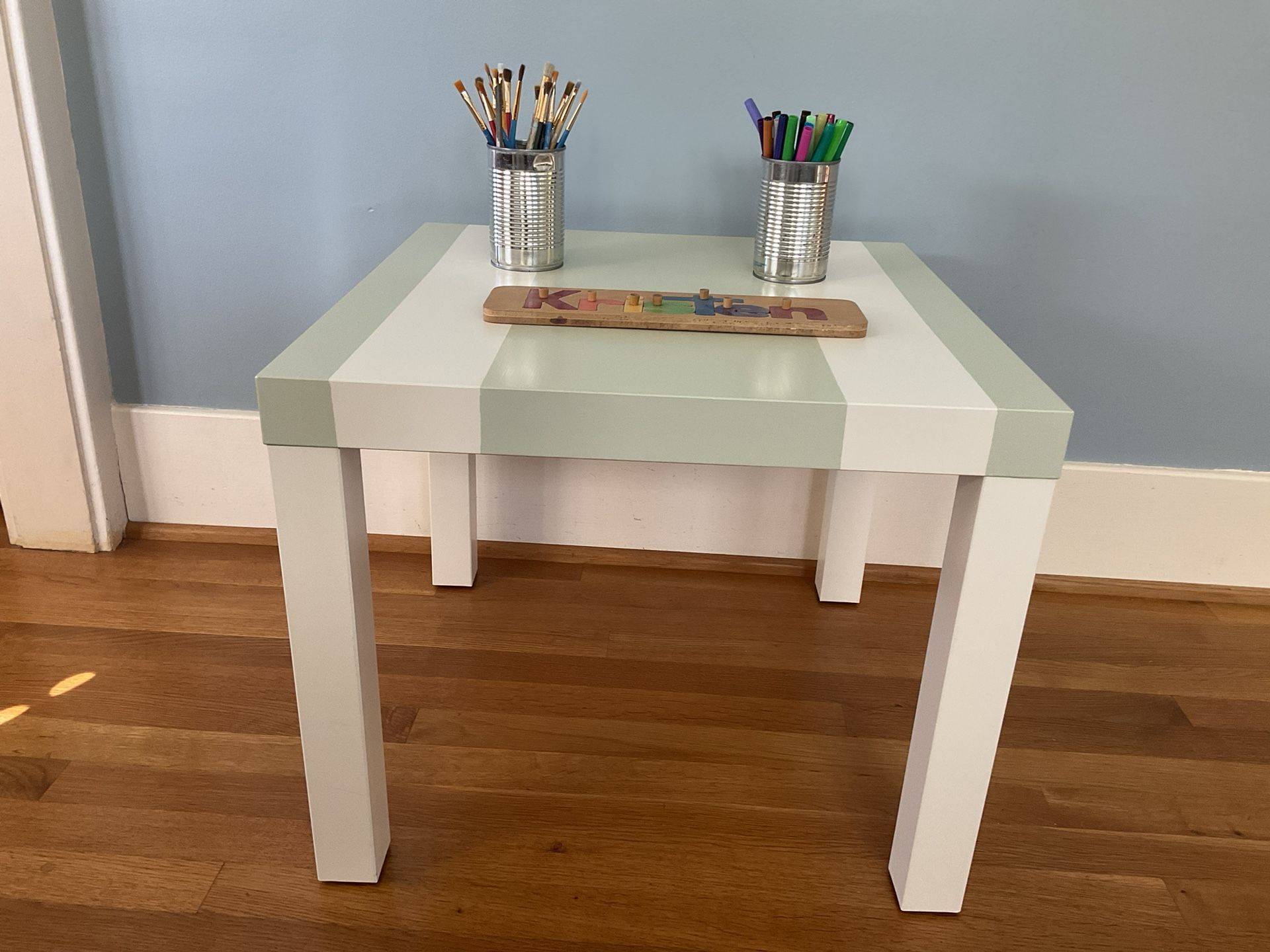 Upcycled Kids Table for sale. This table has been painted with Behr Simply White and Behr Morning Zen in a striped pattern and then clear coated in a satin finish for protection. Great for an activity table or nightstand . Accessories not included. Measurements: 22” across 22” deep 18” tall $25 cash