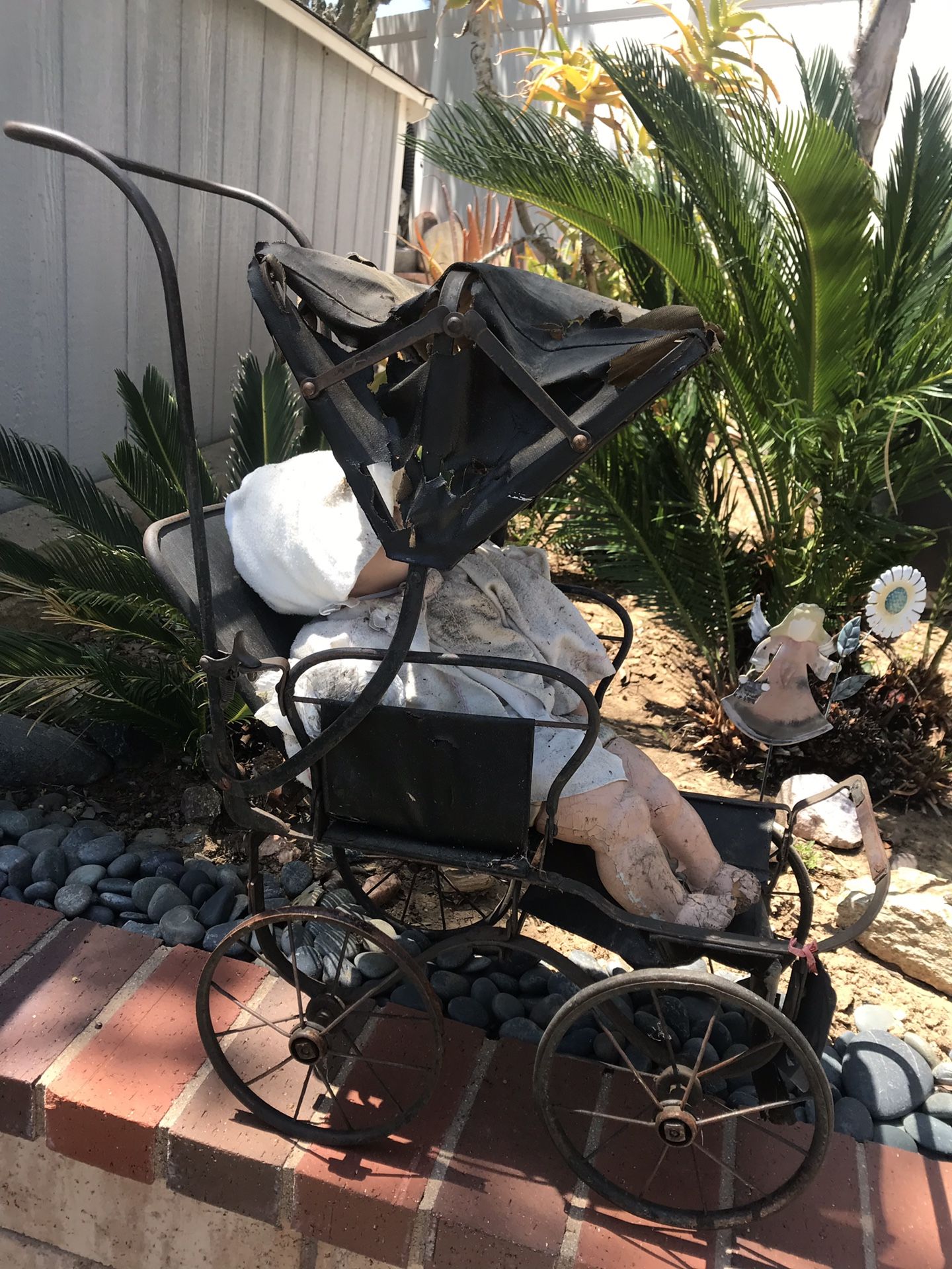 Really old doll & stroller cart made out of metal and leather 70 obo