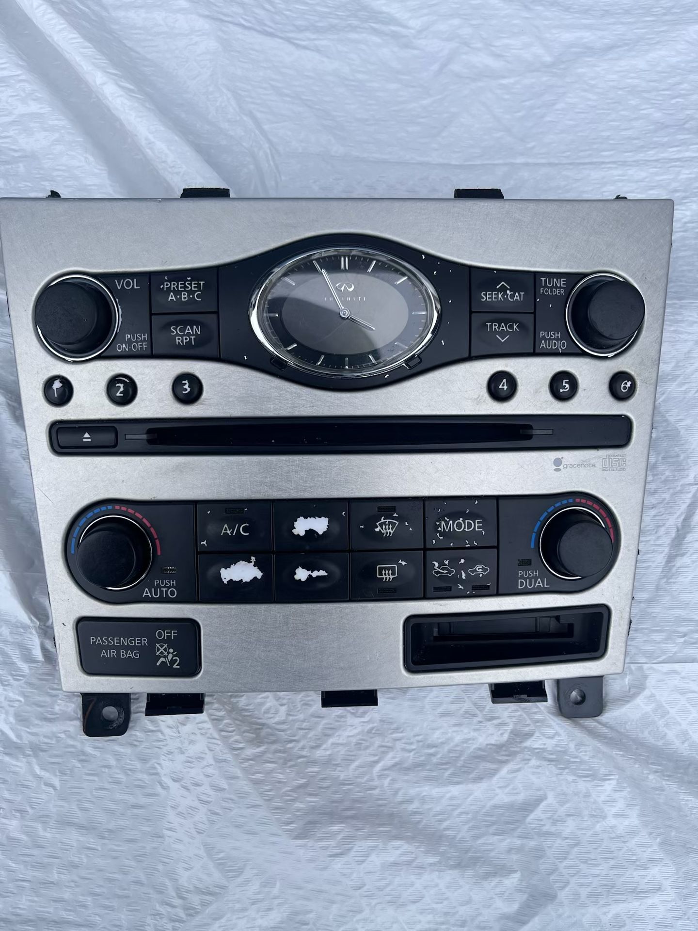 OEM factory radio and climate control unit removed from 2009 Infiniti G37 Coupe. • Fits 2008–2013 G37 Coupe • Non-navigation model • Analog clock • CD player • Dual climate control • All knobs and buttons intact • No cracks • Normal cosmetic wear • Worked before removal Local pickup Washington DC.