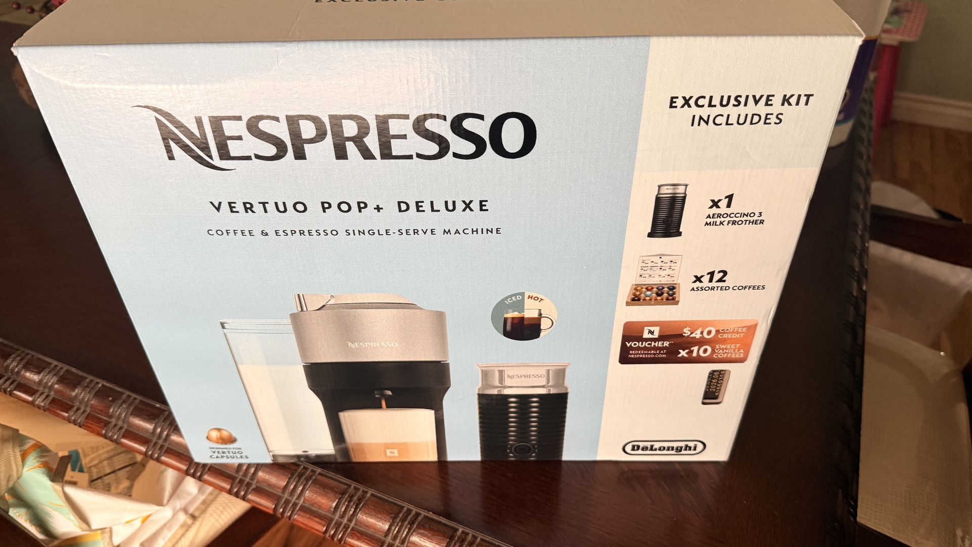 brand new nespresso coffee machine with a areoccino 3 milk frother and 12 assorted coffee pods. The box also comes with a 40$ voucher that you can use on the nespresso website.