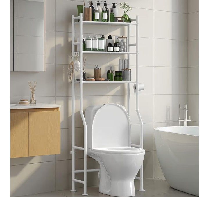 3-Tier Over The Toilet Storage with Paper Holder, Metal Bathroom Organizers and Storage for Small Space, Freestanding Bathroom Shelves with 4 Hooks, Above The Toilet Storage Shelf (White) (2068
