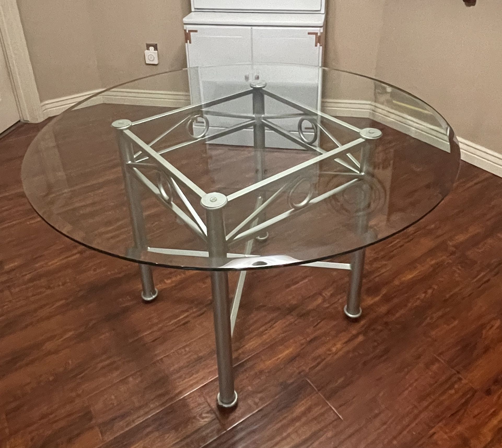 Pre-owned glass top table, sturdy metal frame satin nickel in color. Great condition. Approximately 30” high. Touch up paint included. Pickup 56th Street/Deer Valley Dr. area in Phoenix. Near Desert Ridge Mall.