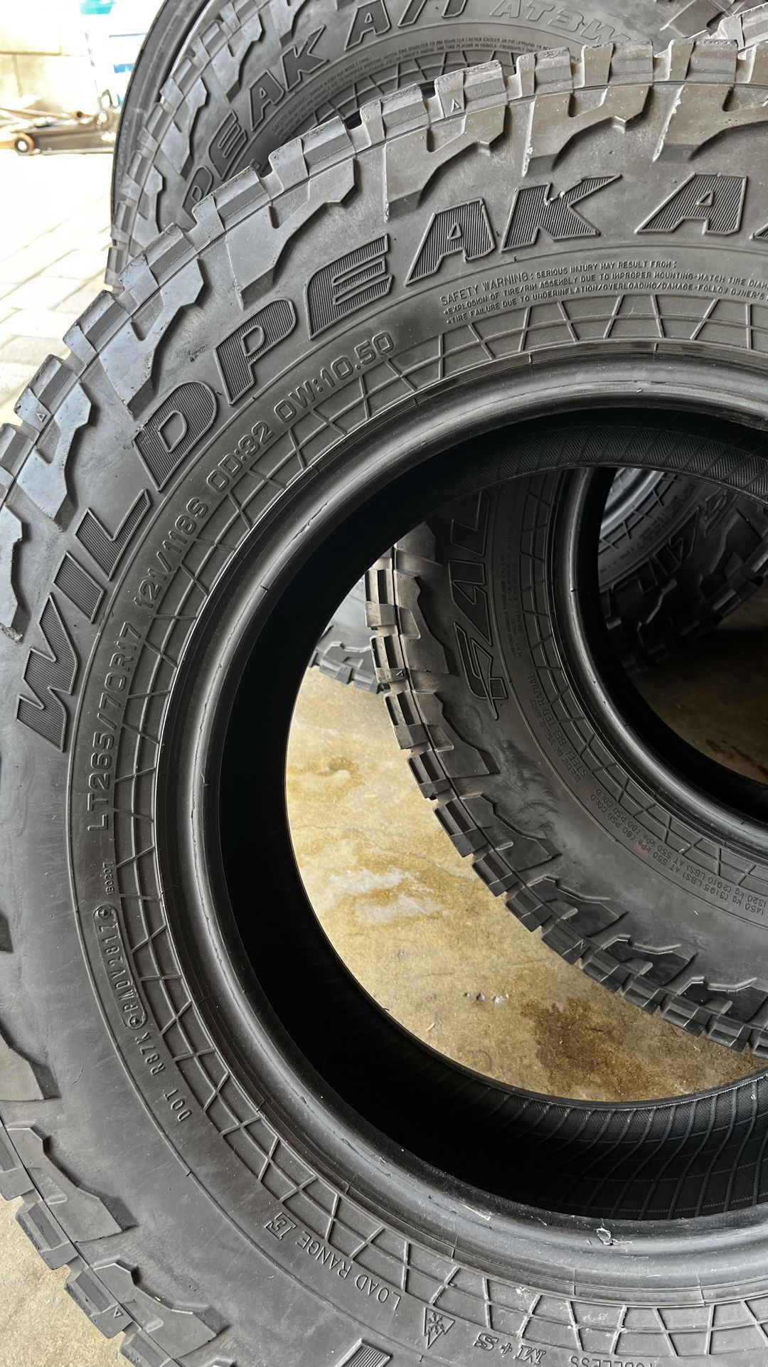 If this ad is up, tires are still available. Tires have a ton of life left. Selling a set of 4 tires. They’re E Rated. All terrain tires. Good for road, rain, snow and offroading. Will fit on a stock tacoma.
