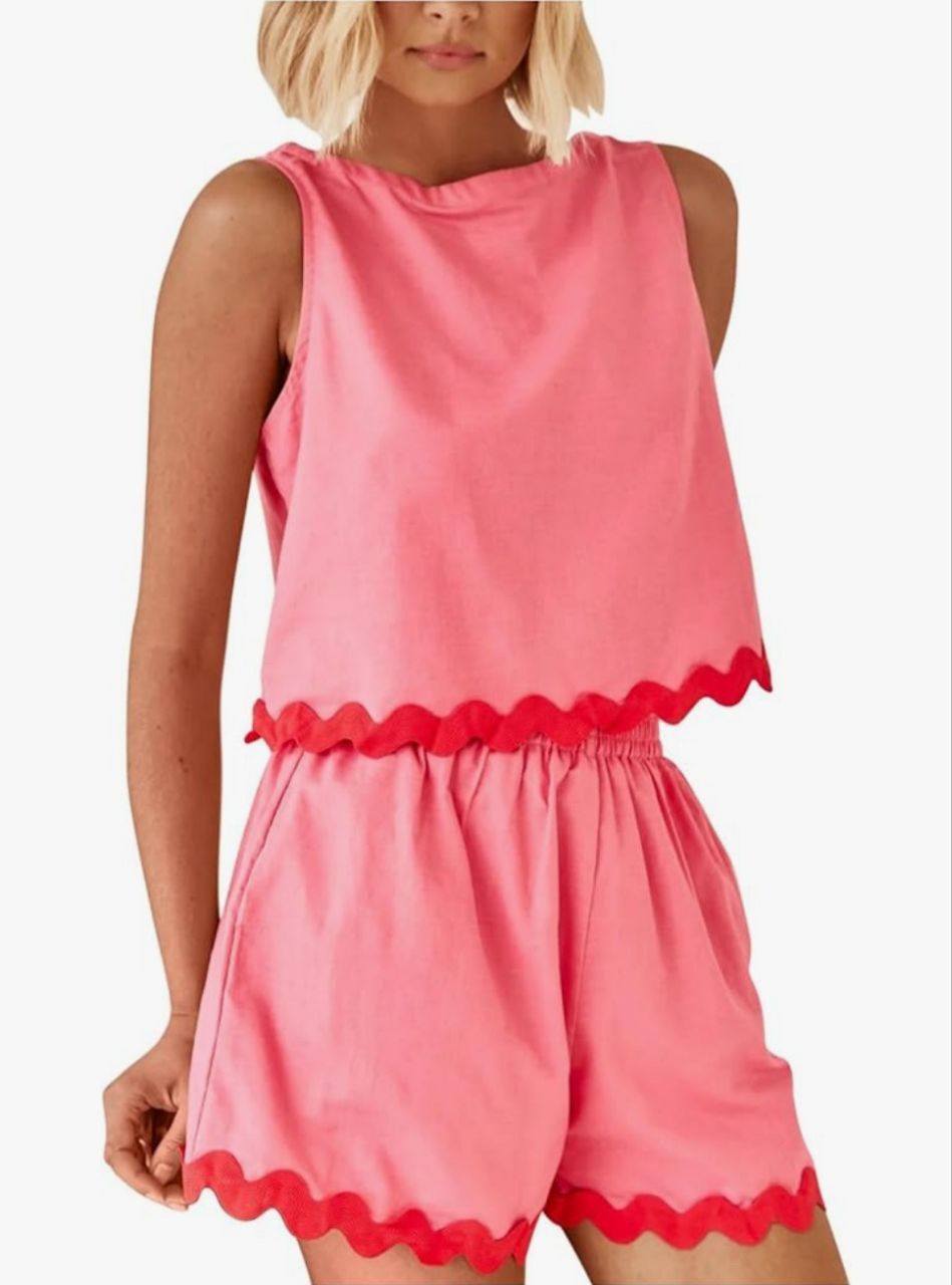 Uillui Short 2 Piece Set for Women Summer Loose Fit Loungewear Scallop Trim Sleeveless Tank Top and Shorts Pajamas Sleepwear. Size S