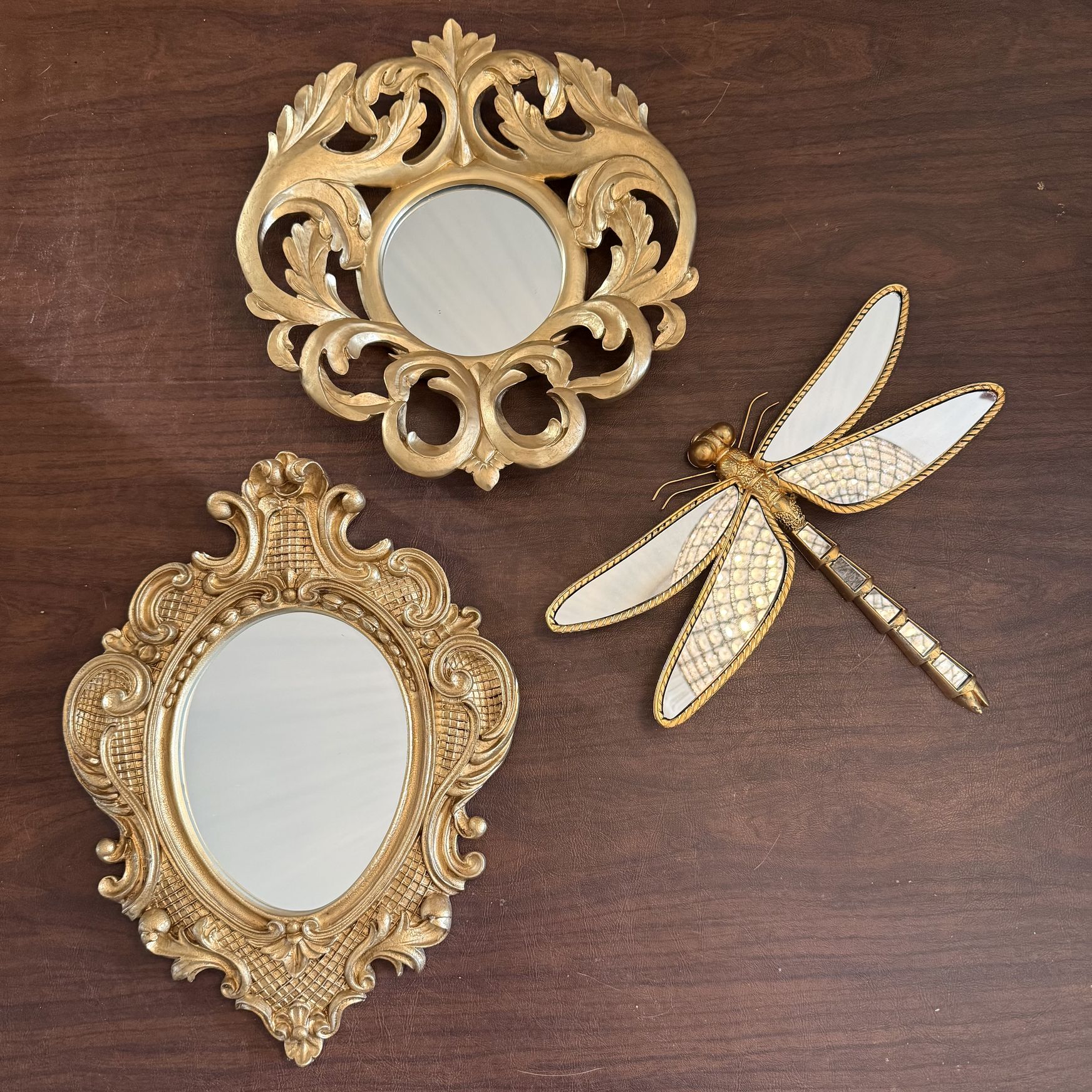 Beautiful grouping of three gold mirrors. One round, 12 inches diameter, one dragonfly, 9.5 inches tall x 12.5 inches wide and one oval mirror, 14 inches tall x 10.5 inches wide. Pick up in Lake Zurich. Cash only please.