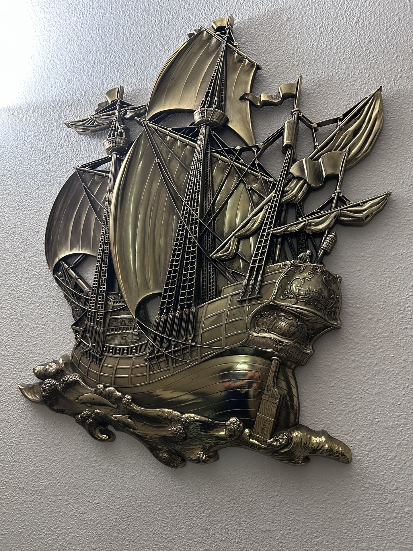 Beautiful vintage gold ship 3D wall hanging decoration in great condition. Size is roughly 29x23, it’s stands out well. Please contact if interested.