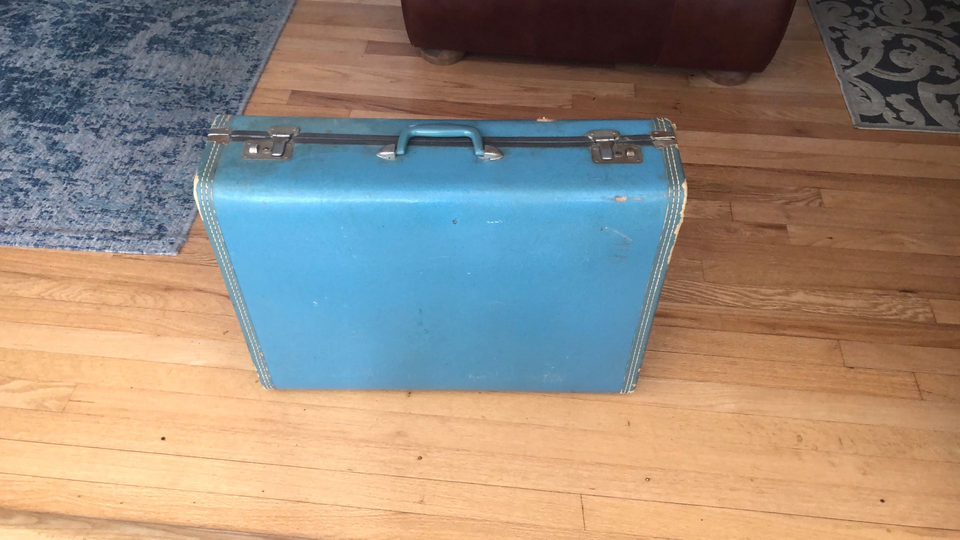Large blue suitcase Worn in several places