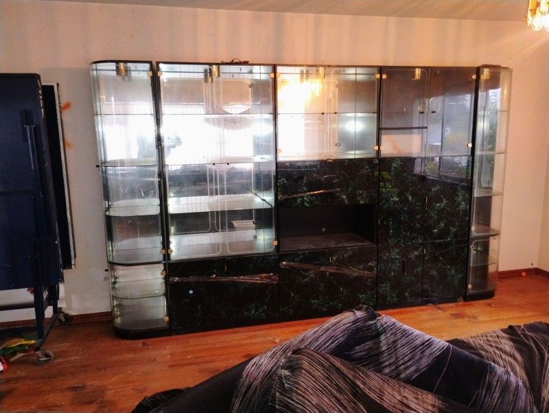This beautiful 5 piece China cabinet comes with light fixtures and glass. Display. All light fixtures work. There's no major damage to this. As you can see in the picture, it is fairly big. There is also a spot to either put a t v or fish tank or display something else of your preference. I love this china cabinet but I am moving and I cannot take it with me