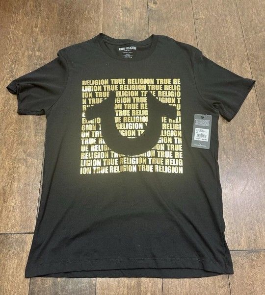True Religion Scripted T-shirt Men’s large Black Gold Letters Cotton. Brand new. With tags