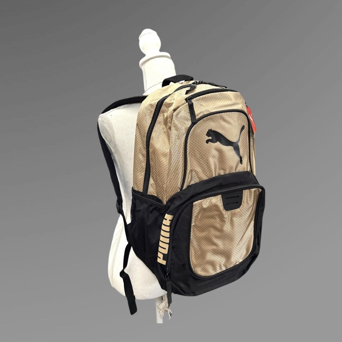 Puma Unisex Contender 3.0 Laptop Backpack in Tan and Black - New with tag, never used. - From practice to classroom, Puma's Contender backpack boasts plenty of room for books, papers and a 15-inch laptop. - Durable weather-resistant polyester construction. - Front zip exterior pocket with inner zip pocket and organization pockets. - Zippered media pocket with slip and zip pockets. - Two-way zip main compartment. - Laptop sleeve fits up to 15" laptop. - Side mesh pockets for water bottle. - Mesh padded back and straps. - Adjustable shoulder straps. - Carry options: Shoulder,Backpack,Hand. - Laptop compartment: Yes. - Material: Polyester. - Retail $68. - External dimensions (HxWxD): 19x12x8".