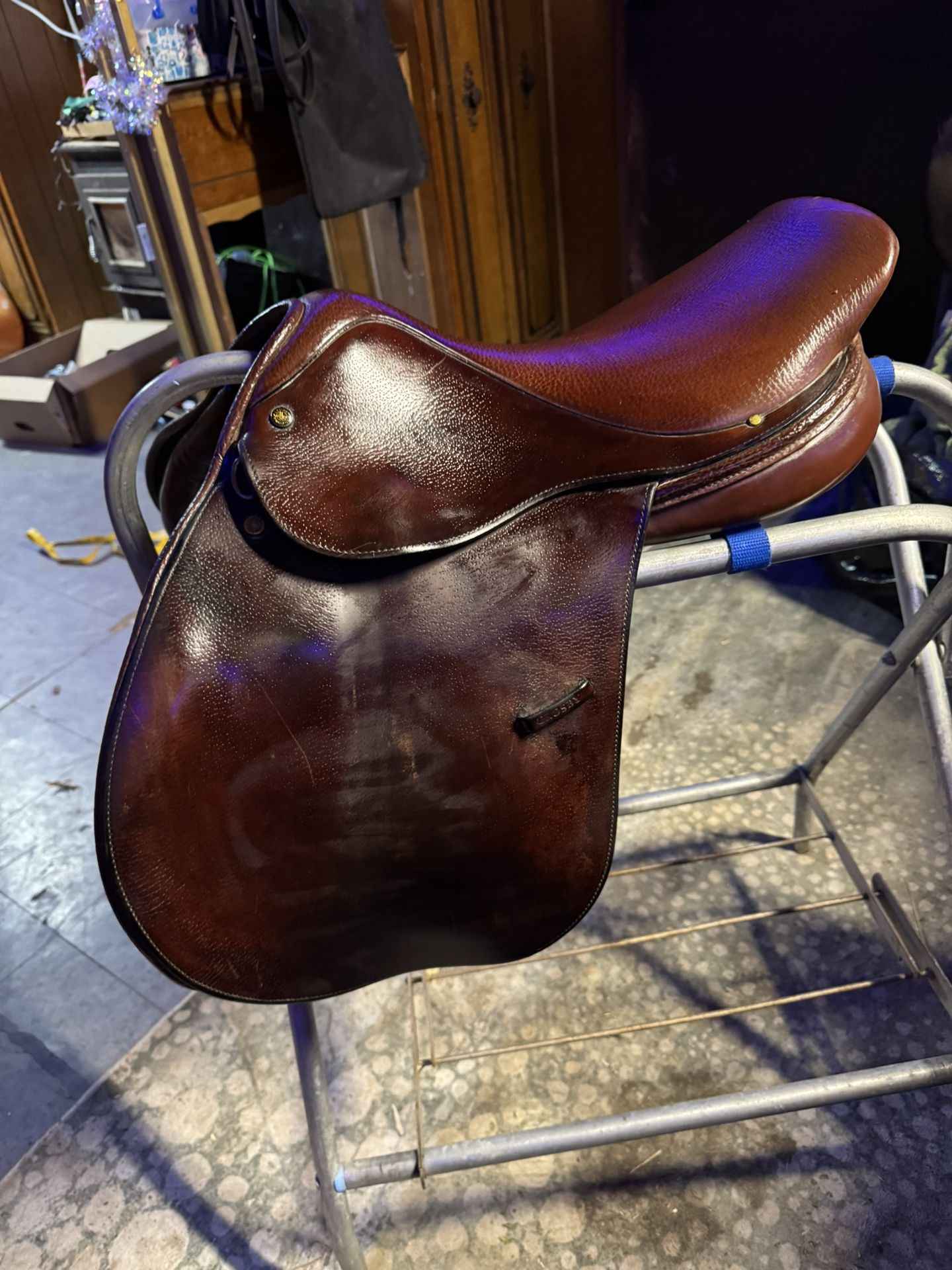Close contact jumping saddle. Knee rolls, billets and seat leather in great condition.