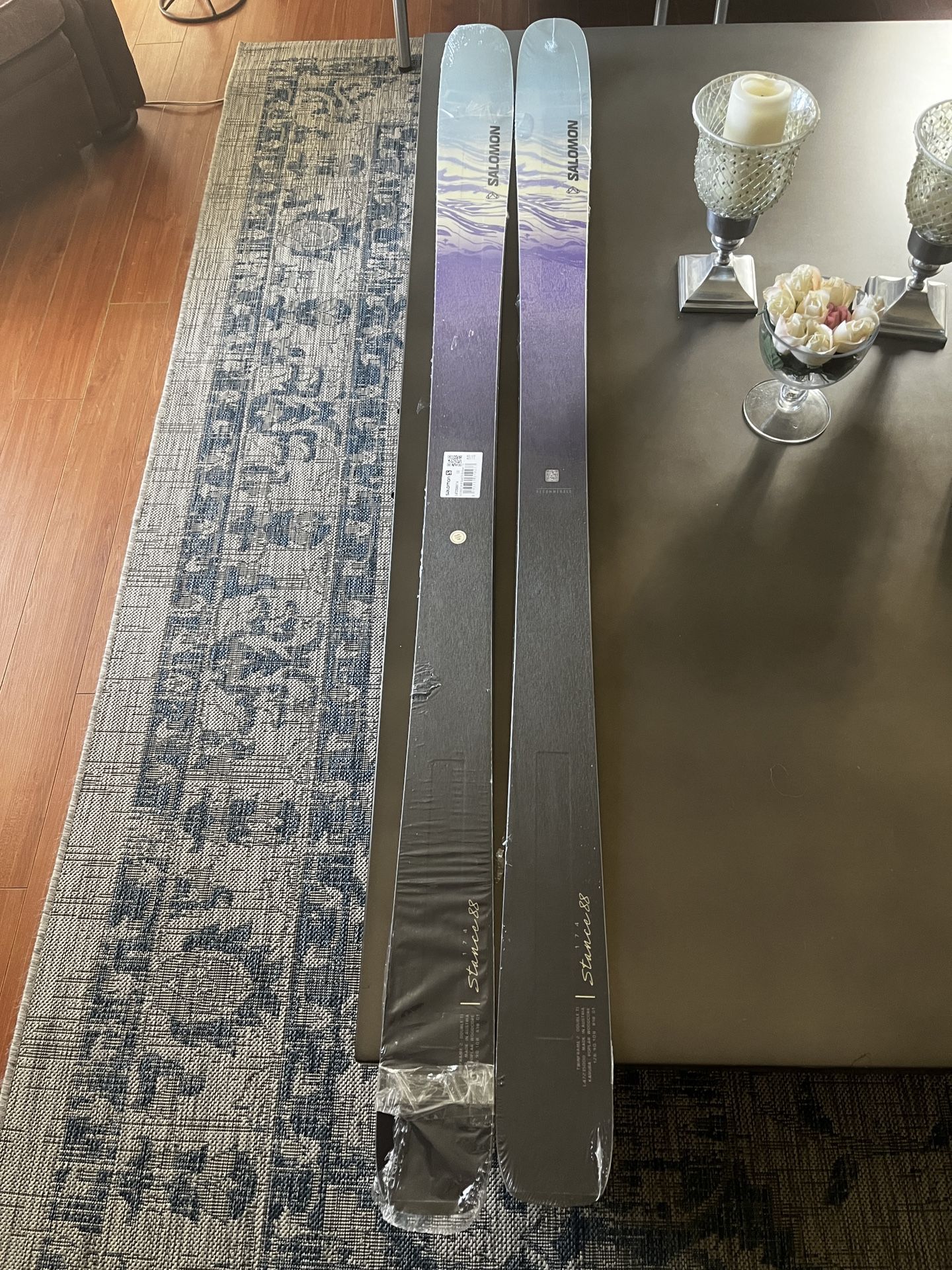 Firm $300 New in plastic wrap 2025 model 90mm under foot 1660gram 174cmm The 2025 Salomon Stance 88 W is a versatile all-mountain ski designed for intermediate to advanced female skiers. It maintains the significant construction updates introduced in the previous season, focusing on a lighter and more energetic feel than earlier iterations. Ski Essentials Ski Essentials +2 Key Features and Specifications Construction: Features a Ti-C Frame that combines a redesigned Titanal layer with carbon and flax inserts (C/FX) for stability and dampening without excessive weight. Core: A blend of karuba and poplar wood, which reduces the ski's weight by approximately 50g compared to older full-poplar versions, enhancing agility. Profile: An all-mountain rocker profile (16% tip rocker, 72% camber underfoot, 12% tail rocker) provides edge grip on hardpack and ease of turn initiation. Dimensions: Most sizes feature an 88mm waist, with a 17m to 18m turn radius depending on length. Ski Essentials Ski Essentials +4 Performance Profile Best For: Skiers who prioritize a "directional" feel with confident edge hold but want a ski that remains maneuverable in bumps and glades. Versatility: It excels on groomed trails and "chopped-up" snow but is less ideal for deep powder due to its narrower 88mm waist. Feel: Testers describe it as energetic and smooth, offering a high "fun factor" with easy pivoting in technical terrain.