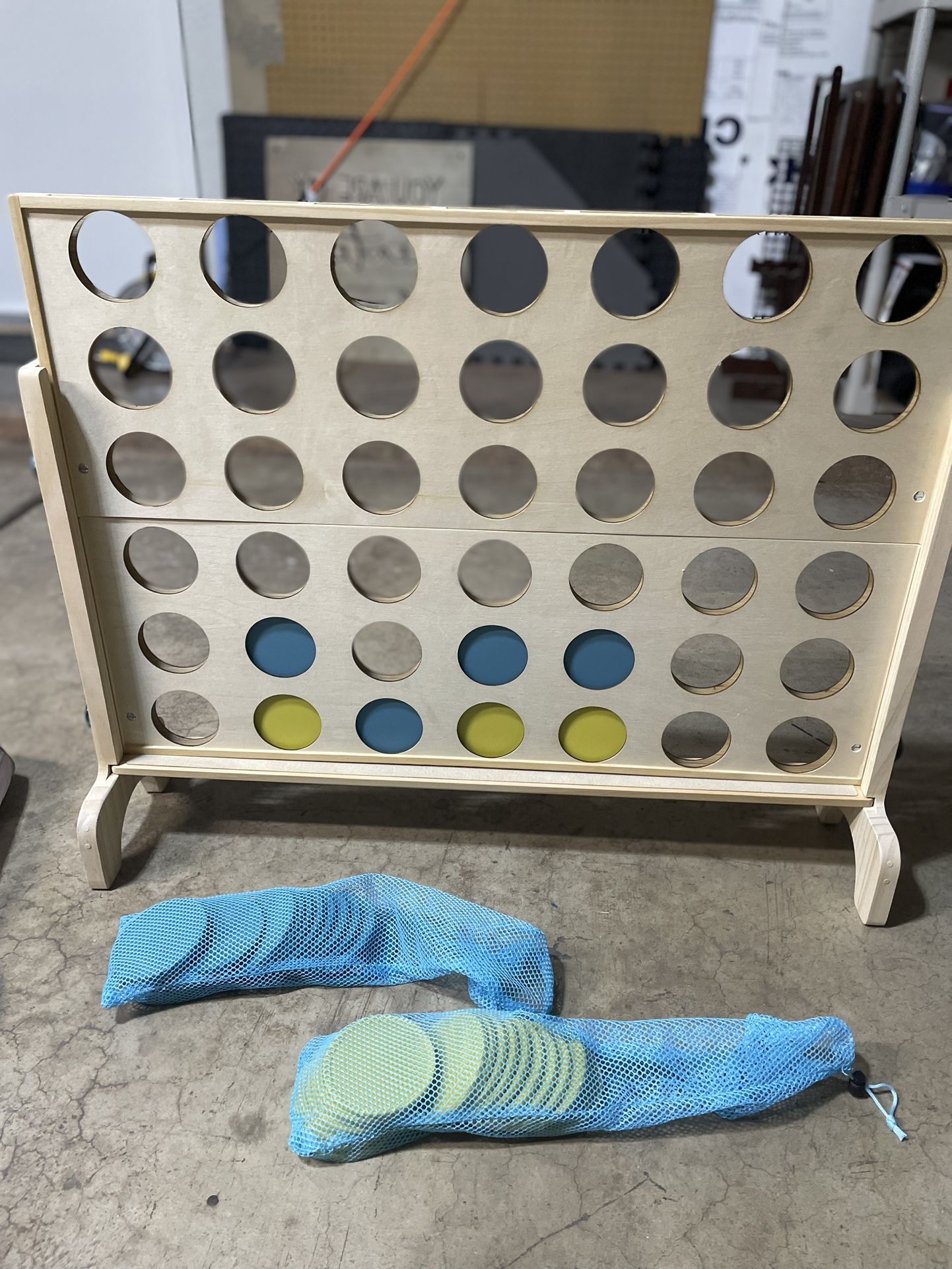 Giant connect 4 set Pine material Designed for 2+ players Suggested for ages 6+ Includes a carrying bag Dimensions (Overall): 24.6 Inches (H) x 36.4 Inches (W) x 3.94 Inches (D) This connect 4 game set includes a wooden game board, 42 colorful coins, a tray, screws Like new, open but never been used.