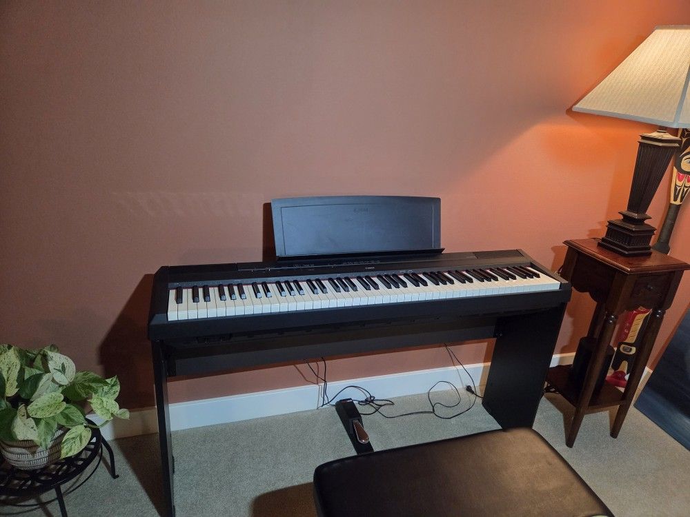 Yamaha 88-key weighted action keyboard with aftermarket sustain pedal in like-new condition. Rich sound comes from it's multiple speakers and the weighted keys help with proper finger strength and technique needed for playing smoothly. There are 14 dedicated buttons for recording/playback features, metronome, accompaniment styles and alternate instrument sounds. This keyboard is great for beginners or skilled pianists alike. Keyboard comes with a sturdy stand and sustain pedal. I have original keyboard box for easy transport.