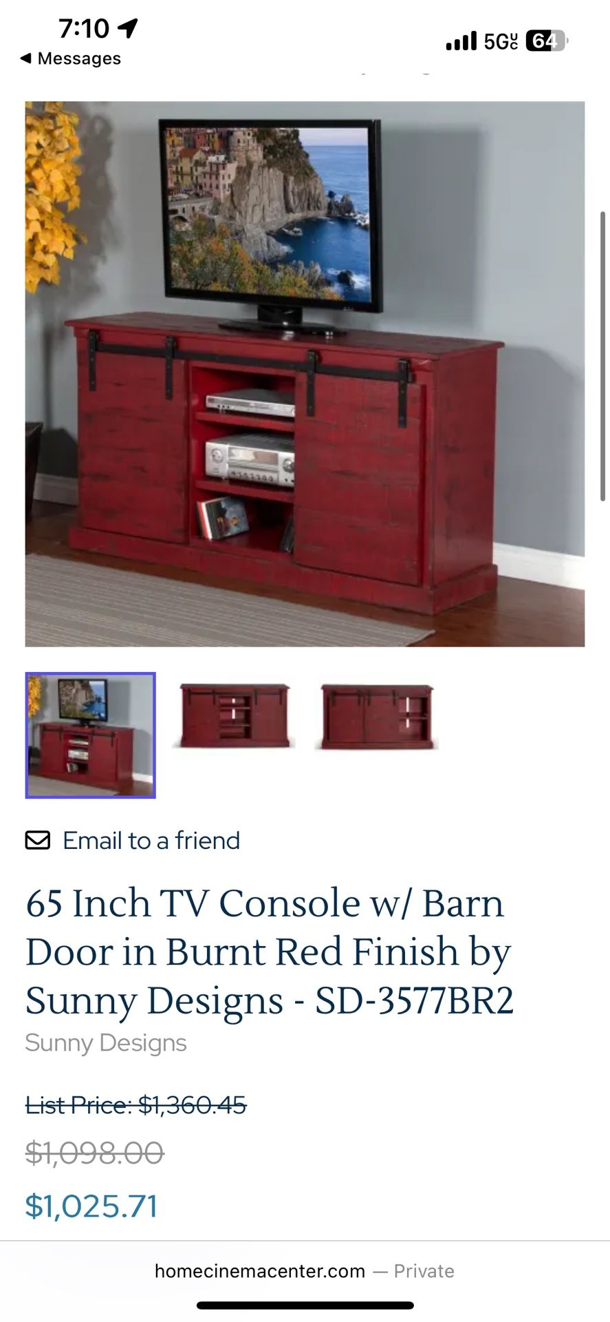 Brand New Never Used Willing to Deliver for an extra 100$ in 15 miles distance from zip code 90034 Will likely need a truck if you pick up Pretty heavy $PRICE OBO if you pick up 65 inch TV stand Distressed red Sliding barn doors in front TV Console: 65"W x 18.5"D x 35"H See website for details of where it is for sale for a brand new one: https://offerup.com/redirect/?o=aHR0cHM6Ly93d3cuaG9tZWNpbmVtYWNlbnRlci5jb20vUHJvZHVjdERldGFpbHMuYXNwP1Byb2R1Y3RDb2RlPVNELTM1NzdCUjImY2xpY2s9MiZnYWRfc291cmNlPTEmZ2NsaWQ9Q2p3S0NBaUFxckc5QmhBVkVpd0FhUHU1empuUTV2dTdtcWxlYVlsNWN4cXRSc3h1X2l0LXZWd213NDBRQWF0LXdmaERyY0w4bVF4TFFob0NKOFFRQXZEX0J3RQ==