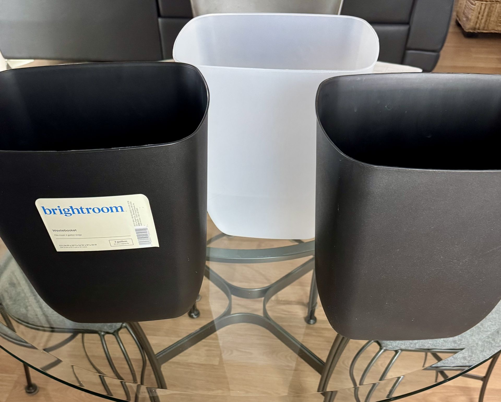 3 plastic trash cans from Target, 2 black 1 white, barely used and always had bag liner, not dirty at all. They are 3 gallon size. All 3 for 5$. No delivery.