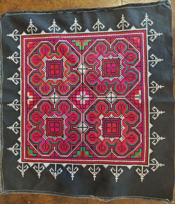 Hidden Treasures on the Brick Road 10003 270th St NW, Stanwood, WA 98292 Open: Fridays 1pm - 4pm & Saturdays 1pm - 6pm Length (inches): 15.00 Width (inches): 13.00 Height (inches): 0.01 This striking vintage textile panel features intricate hand-embroidered cross-stitch work in vivid pink, red, green, and white threads against a black cotton background. The symmetrical geometric and floral pattern, bordered with white arrowhead-style motifs, may be associated with textile traditions from Southeast Asia—potentially Hmong or other regional hill tribes—though specific cultural origin is not definitively confirmed. The reverse side reveals traditional hand-stitched construction. This panel is ideal for framing, repurposing in fiber arts, or as a collectible example of ethnic needlework. Minor fraying and thread tails are present on the edges consistent with vintage handmade condition. Bullet Points for eBay/Etsy: Hand-embroidered vintage textile panel Likely Southeast Asian or Hmong-style cross-stitch design Colors: black background with red, pink, green, and white embroidery Cotton fabric with reverse-side stitching visible Excellent example for textile collectors, craft projects, or display Vintage condition with minor edge fraying and loose threads