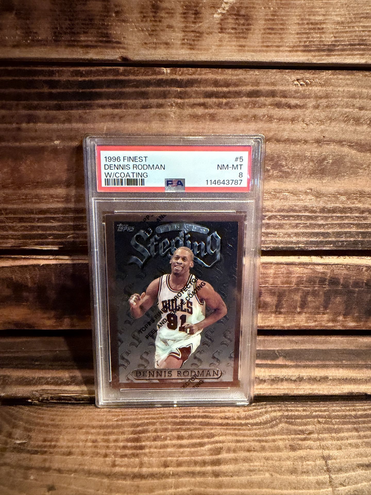 Topps 1996 Finest Dennis Rodman with coating, graded NM-MT 8. Start your PSA collection by owning this historic memorabilia slab with Chicago Bulls Dennis Rodman PSA 8 1996 Finest card, graded NM/MT 8, #5 If interested Open to trades Raw & PSA as well: UFC Soccer One Piece Jordan’s Kobe’s LeBron Brady’s Catlin