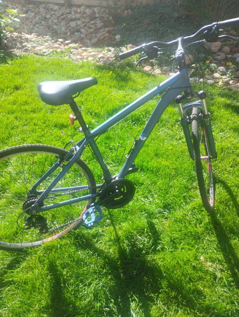 Excellent commuting bike, 21 speed trigger shifters, new brake lines, comfortable seat no rips very comfortable and fast ride, good tires and chain, everything works and rides well. This medium sized bike is nationally registered online to protect from theft. Like new upgraded DK pedals ($59) and the bike is around $400 new. Can be shown almost anytime in SE Boulder right off the highway first exit. $50/ best must sell no reasonable offer refused just added really nice rack with tension bar to secure cargo