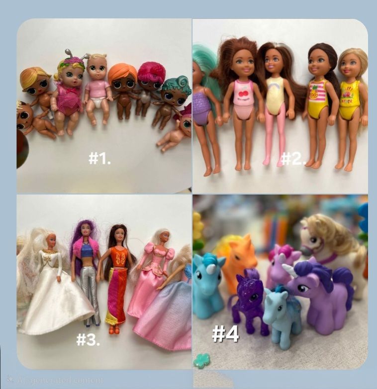 #1 LOL Surprise Dolls (8 pcs) Assorted LOL mini dolls β some outfits missing. π° $4 #2 Small Fashion Dolls (5 pcs) Cute small-size fashion dolls in good condition. π° $#3 #3 Barbie Dolls (5 pcs+1 pcs free) Assorted Barbie dolls with dresses included. π° $3 #4 unicorn and pony toy figures Colorful small toy animals that are great for pretend play, storytelling, or toy collections. Perfect for kids who enjoy fantasy animals and imaginative play. Set includes several unicorn and pony figures in different colors and styles. π° $5 for all