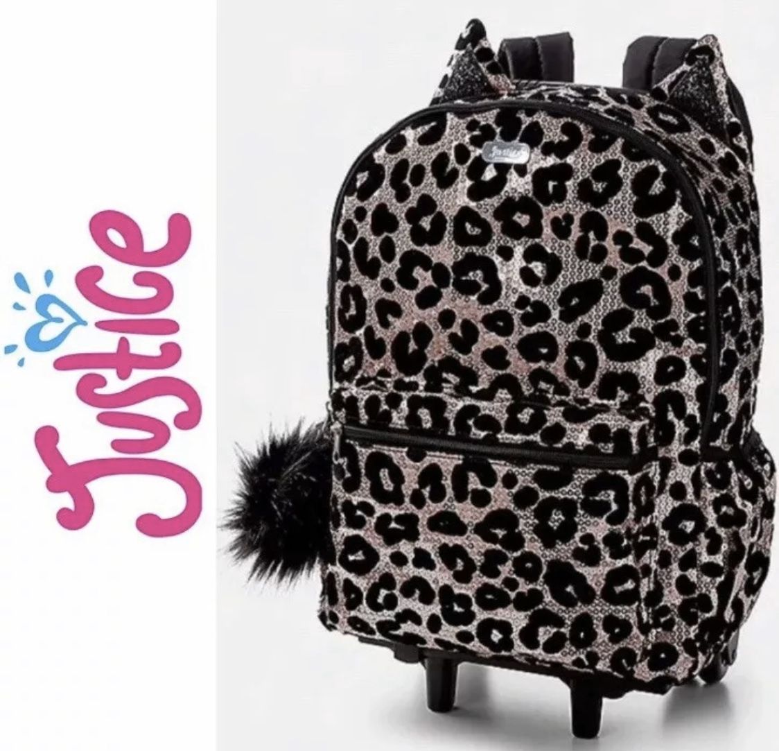 Brand NEW! Justice CHEETAH Leopard Sequins ROLLING Backpack Girls Suit Case Luggage Rolling Backpack Wheelie Cheetah Sequin Travel Bag •Shimmering sequin finish with a wild cheetah design, complete with plush ears •Rolling design with an extendable handle •Two zip compartments with two side pockets •Padded straps that clip and un-clip for multiple ways to carry •Special keychain loop to customize her look. A pompom charm get's her collection started! 11" W x 5.5" W x 19.5" H 21.5" handle when extended NEW WITH TAGS!