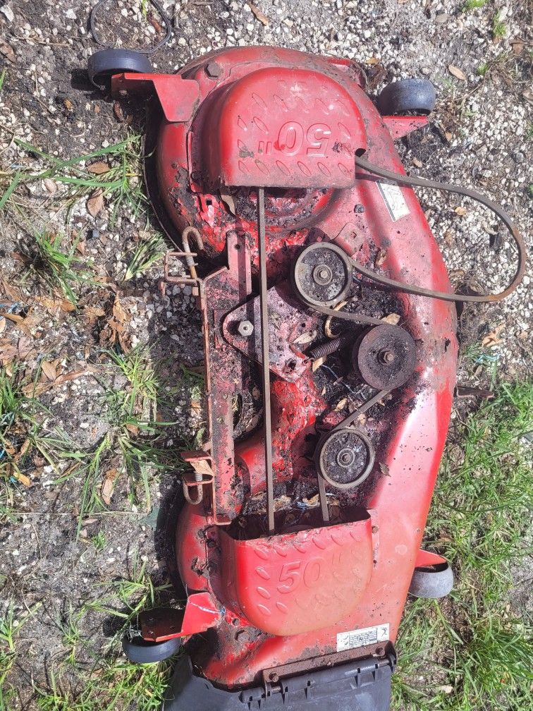 ((NOT FOR ZEROTURN)) ((As is sells)) you pickup. No delivery. ((NO HOLES lots of surface rust))((Needs spindle work)) 50" deck fits MOST troybilt/toro/LT1042 cubcadet riding mowers