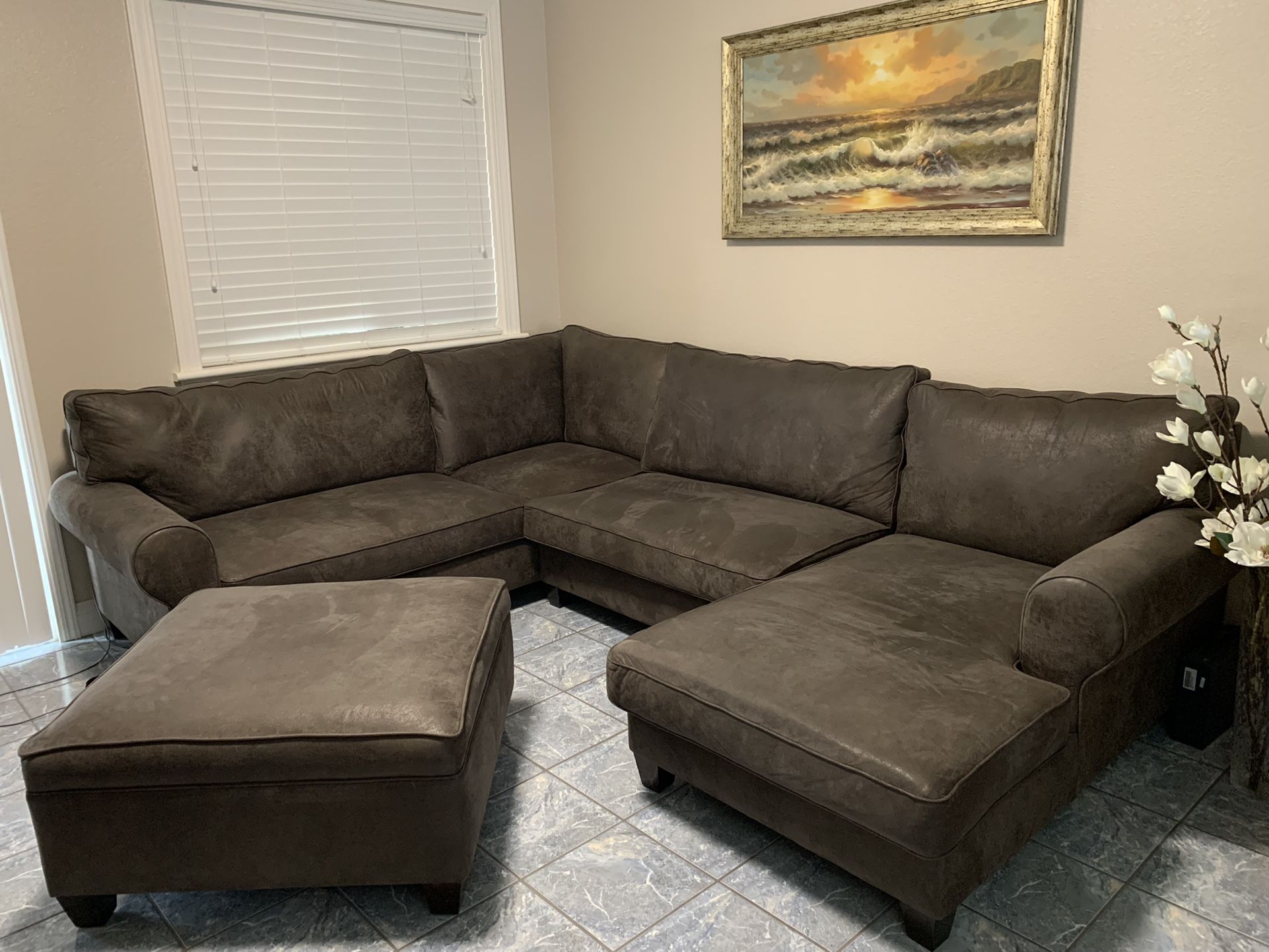This custom made, great quality, multi use will make any living room space so inviting! Custom sizes made - details in last photos. Paid over $2000 asking $1200 due to excellent condition ( NO signs of wear/damages. No pets/no children nonšsmoking home) EASY to clean material (soft leather feel Dakota carbon fabric) EASY to move as ALL the sections/cushions come off. ALSO big Bonus - comfortably sleeps 2 people when guests are over!