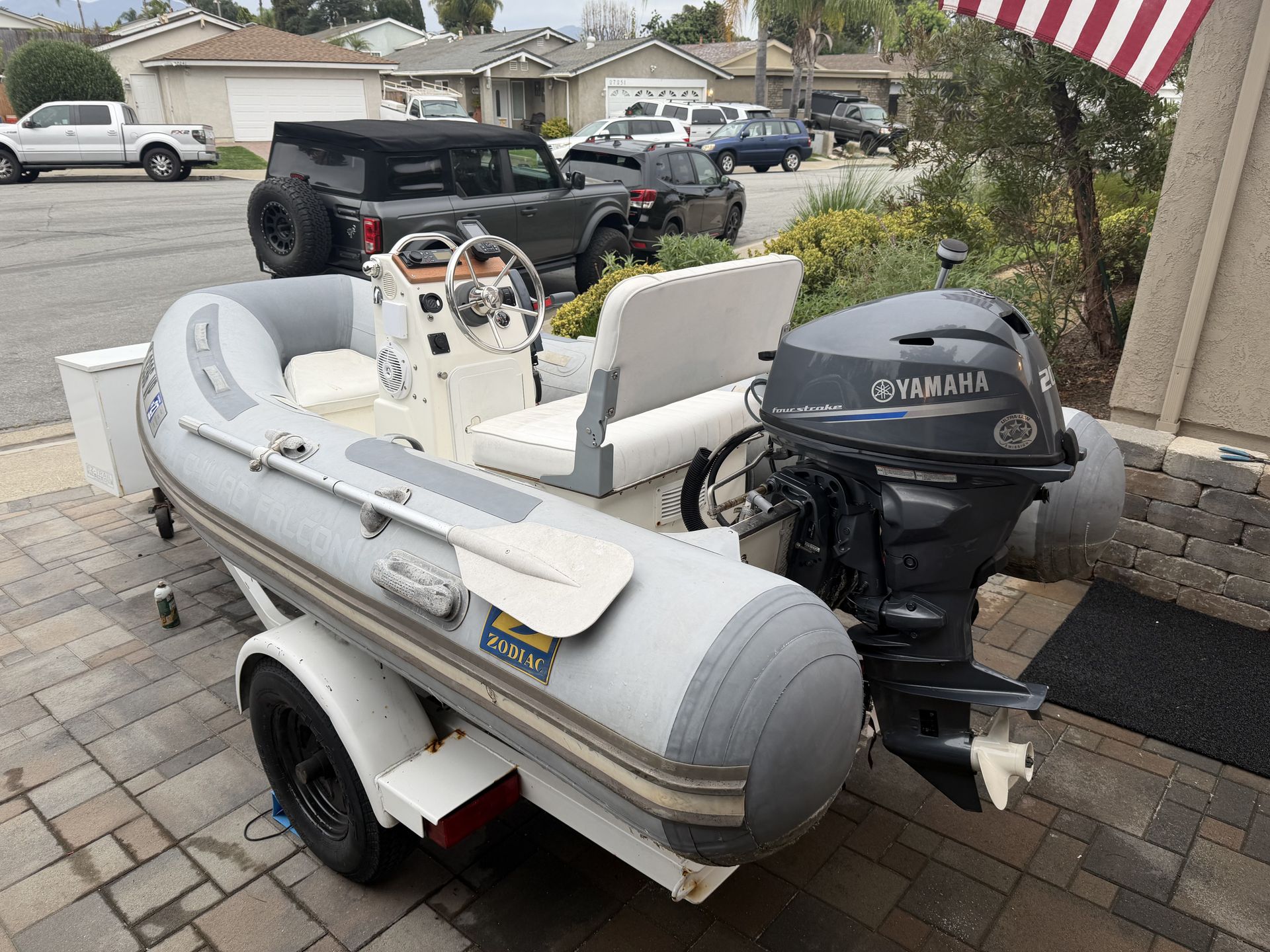 2011 10 ft Zodiac 2021 Yamaha 20hp outboard Runs perfectly Low and hours Holds air Bluetooth stereo Usb - C charging Anchor Locker 6 Gal Tank Electric Tilt Fish finder / gps Fuel gauge Navigation lights Floor lighting Stainless steering wheel Includes trailer